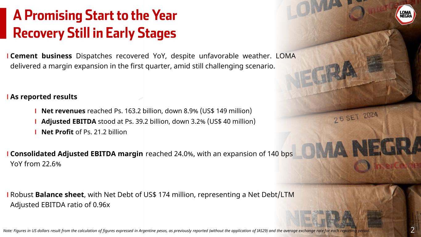Disclaimer and Forward-Looking Statement This presentation may contain forward-looking statements within the meaning of federal securities law that are subject to risks and uncertainties. These statements are only predictions based upon our current expectations and projections about possible or assumed future results of our business, financial condition, results of operations, liquidity, plans and objectives. In some cases, you can identify forward-looking statements by terminology such as “believe,” “may,” “estimate,” “continue,” “anticipate,” “intend,” “should,” “plan,” “expect,” “predict,” “potential,” “seek,” “forecast,” or the negative of these terms or other similar expressions. The forward-looking statements are based on the information currently available to us. There are important factors that could cause our actual results, level of activity, performance or achievements to differ materially from the results, level of activity, performance or achievements expressed or implied by the forward-looking statements, including, among others things: changes in general economic, political, governmental and business conditions globally and in Argentina, changes in inflation rates, fluctuations in the exchange rate of the peso, the level of construction generally, changes in cement demand and prices, changes in raw material and energy prices, changes in business strategy and various other factors. You should not rely upon forward-looking statements as predictions of future events. Although we believe in good faith that the expectations reflected in the forward-looking statements are reasonable, we cannot guarantee that future results, levels of activity, performance and events and circumstances reflected in the forward-looking statements will be achieved or will occur. Any or all of Loma Negra’s forward-looking statements in this release may turn out to be wrong. You should consider these forward-looking statements in light of other factors discussed under the heading “Risk Factors” in Company’s Annual Report on Form 20-F, as well as periodic filings made on Form 6-K, which are filed with or furnished to the United States Securities and Exchange Commission. Except as required by law, we undertake no obligation to update publicly any forward-looking statements for any reason after the date of this release to conform these statements to actual results or to changes in our expectations. The Company presented some figures converted from Argentine pesos to U.S. dollars for comparison purposes. The exchange rate used to convert Pesos to U.S. dollars was the reference exchange rate (Communication “A” 3500) reported by the Central Bank for U.S. dollars. The information presented in U.S. dollars is for the convenience of the reader only. Certain figures included in this report have been subject to rounding adjustments. Accordingly, figures shown as totals in certain tables may not be arithmetic aggregations of the figures presented in previous quarters. Note: Loma Negra’s financial information has been prepared in accordance with the Argentine Securities Commission (Comisión Nacional de Valores-CNV) and with International Financial Reporting Standards. Following the categorization of Argentina as a country with a three-year cumulative inflation rate greater than 100%, the country is considered highly inflationary in accordance with IFRS. Consequently, starting July 1, 2018, the Company is reporting results applying IFRS rule IAS 29. IAS 29 requires that results of operations in hyperinflationary economies are reported as if these economies were highly inflationary as of January 1, 2018, and thus year-to-date, together with comparable results, should be restated adjusting for the change in general purchasing power of the local currency, using official indices. For comparison purposes and a better understanding of our underlying performance, in addition to presenting ‘As Reported’ results, we are also disclosing selected figures as previously reported excluding rule IAS 29. Additional information in connection with the application of rule IAS 29 can be found in our earnings report. 1