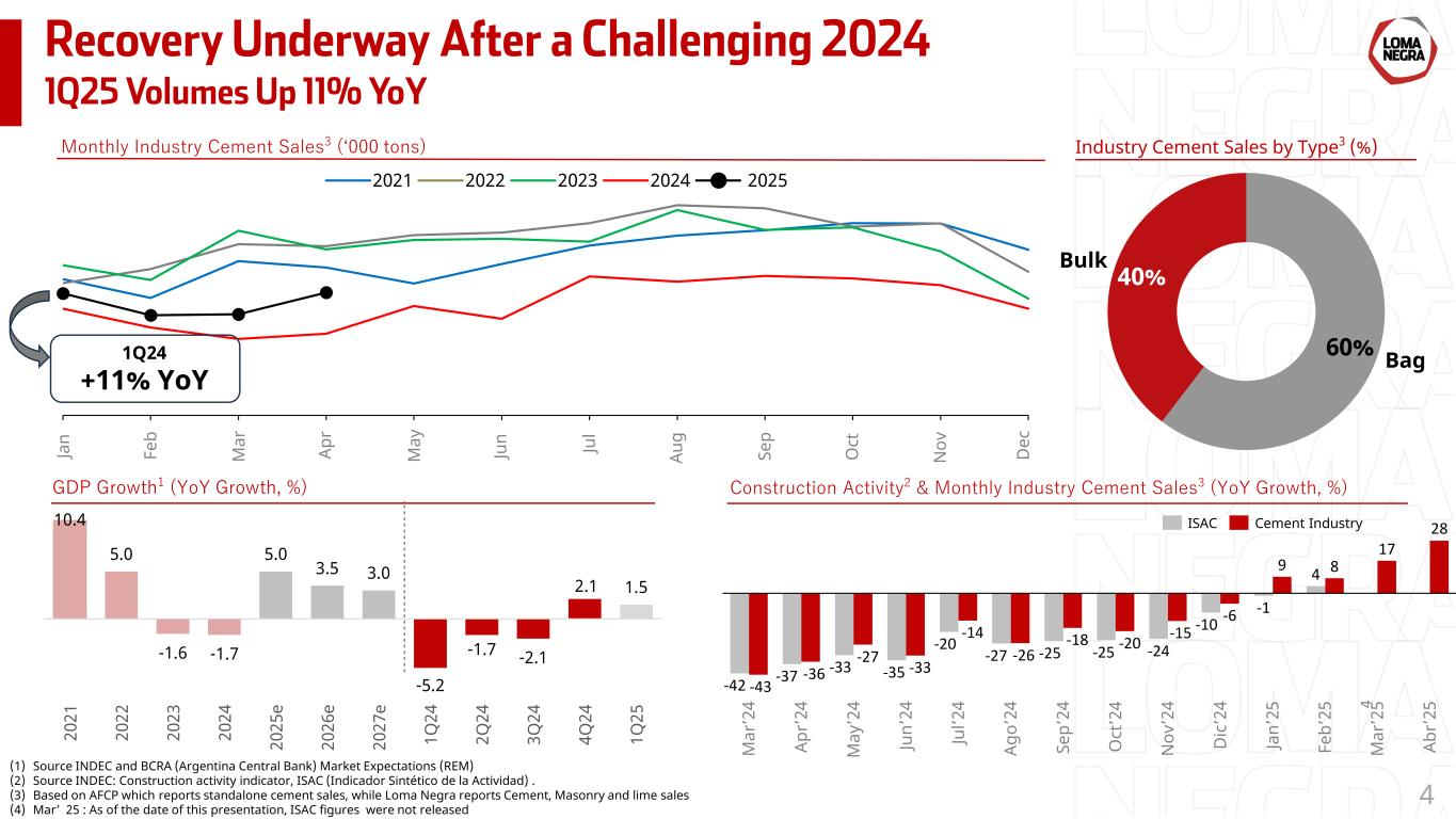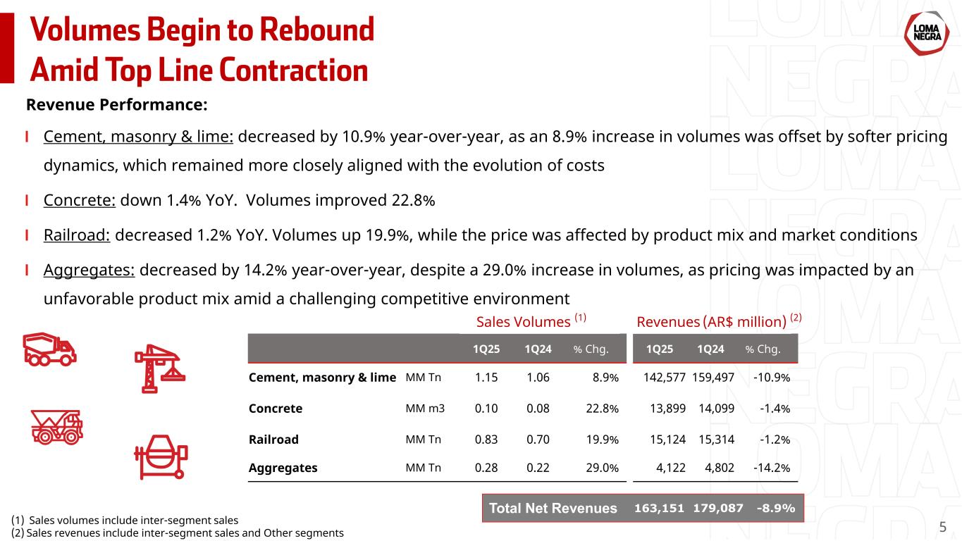 Recovery Underway After a Challenging 2024 1Q25 Volumes Up 11% YoY 10.4 5.0 -1.6 -1.7 5.0 3.5 3.0 -5.2 -1.7 -2.1 2.1 1.5 20 21 20 22 20 23 20 24 20 25 e 20 26 e 20 27 e 1Q 24 2Q 24 3Q 24 4Q 24 1Q 25 GDP Growth1 (YoY Growth, %) Ap r Fe b Ja n M ar M ay N ovJu n Au g D ec Se p O ct 202520222021 2024 Monthly Industry Cement Sales3 (‘000 tons) 2023 -42 -37 -33 -35 -20 -27 -25 -25 -24 -10 -1 4 -43 -36 -27 -33 -14 -26 -18 -20 -15 -6 9 8 17 28 M ar ’2 4 Ap r’ 24 M ay ’2 4 Ju n’ 24 Ju l’2 4 Ag o’ 24 Se p’ 24 O ct ’2 4 N ov ’2 4 D ic ’2 4 Ja n’ 25 Fe b’ 25 M ar ’2 5 Ab r’ 25 ISAC Cement Industry Ju l Industry Cement Sales by Type3 (%) Construction Activity2 & Monthly Industry Cement Sales3 (YoY Growth, %) (1) Source INDEC and BCRA (Argentina Central Bank) Market Expectations (REM) (2) Source INDEC: Construction activity indicator, ISAC (Indicador Sintético de la Actividad) . (3) Based on AFCP which reports standalone cement sales, while Loma Negra reports Cement, Masonry and lime sales (4) Mar’ 25 : As of the date of this presentation, ISAC figures were not released 60% 40% Bag Bulk 4 1Q24 +11% YoY 4