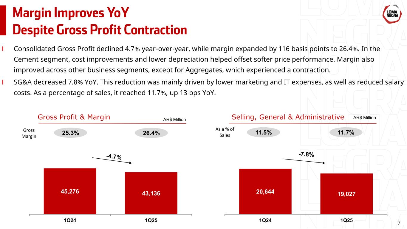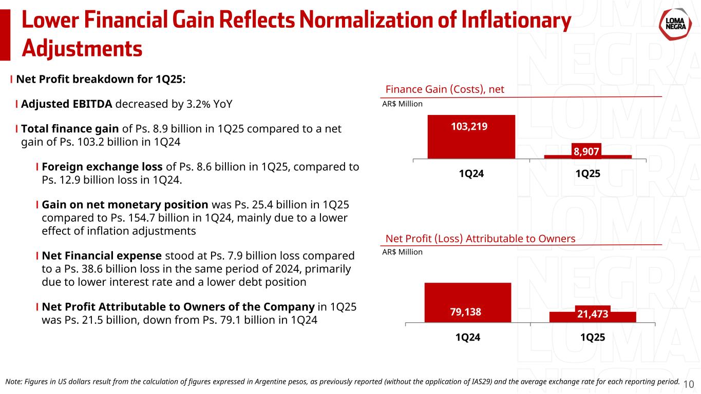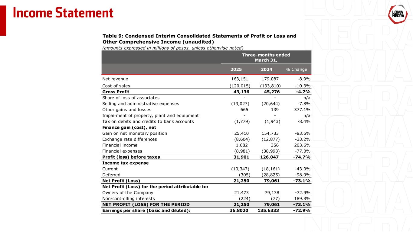 Income Statement (amounts expressed in millions of pesos, unless otherwise noted) 2025 2024 % Change Net revenue 163,151 179,087 -8.9% Cost of sales (120,015) (133,810) -10.3% Gross Profit 43,136 45,276 -4.7% Share of loss of associates - - n/a Selling and administrative expenses (19,027) (20,644) -7.8% Other gains and losses 665 139 377.1% Impairment of property, plant and equipment - - n/a Tax on debits and credits to bank accounts (1,779) (1,943) -8.4% Finance gain (cost), net Gain on net monetary position 25,410 154,733 -83.6% Exchange rate differences (8,604) (12,877) -33.2% Financial income 1,082 356 203.6% Financial expenses (8,981) (38,993) -77.0% Profit (loss) before taxes 31,901 126,047 -74.7% Income tax expense Current (10,347) (18,161) -43.0% Deferred (305) (28,825) -98.9% Net Profit (Loss) 21,250 79,061 -73.1% Net Profit (Loss) for the period attributable to: Owners of the Company 21,473 79,138 -72.9% Non-controlling interests (224) (77) 189.8% NET PROFIT (LOSS) FOR THE PERIOD 21,250 79,061 -73.1% Earnings per share (basic and diluted): 36.8020 135.6333 -72.9% Table 9: Condensed Interim Consolidated Statements of Profit or Loss and Other Comprehensive Income (unaudited) Three-months ended March 31,