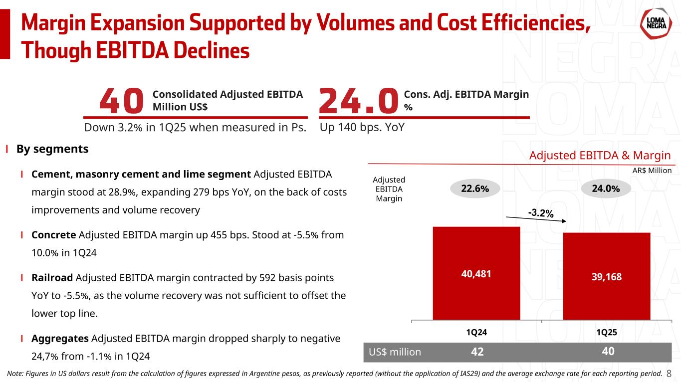 Margin Improves YoY Despite Gross Profit Contraction Consolidated Gross Profit declined 4.7% year-over-year, while margin expanded by 116 basis points to 26.4%. In the Cement segment, cost improvements and lower depreciation helped offset softer price performance. Margin also improved across other business segments, except for Aggregates, which experienced a contraction. SG&A decreased 7.8% YoY. This reduction was mainly driven by lower marketing and IT expenses, as well as reduced salary costs. As a percentage of sales, it reached 11.7%, up 13 bps YoY. 45,276 43,136 1Q24 1Q25 Gross Profit & Margin 20,644 19,027 1Q24 1Q25 Selling, General & Administrative As a % of Sales AR$ Million AR$ Million Gross Margin 25.3% 11.5% 7 26.4% 11.7%