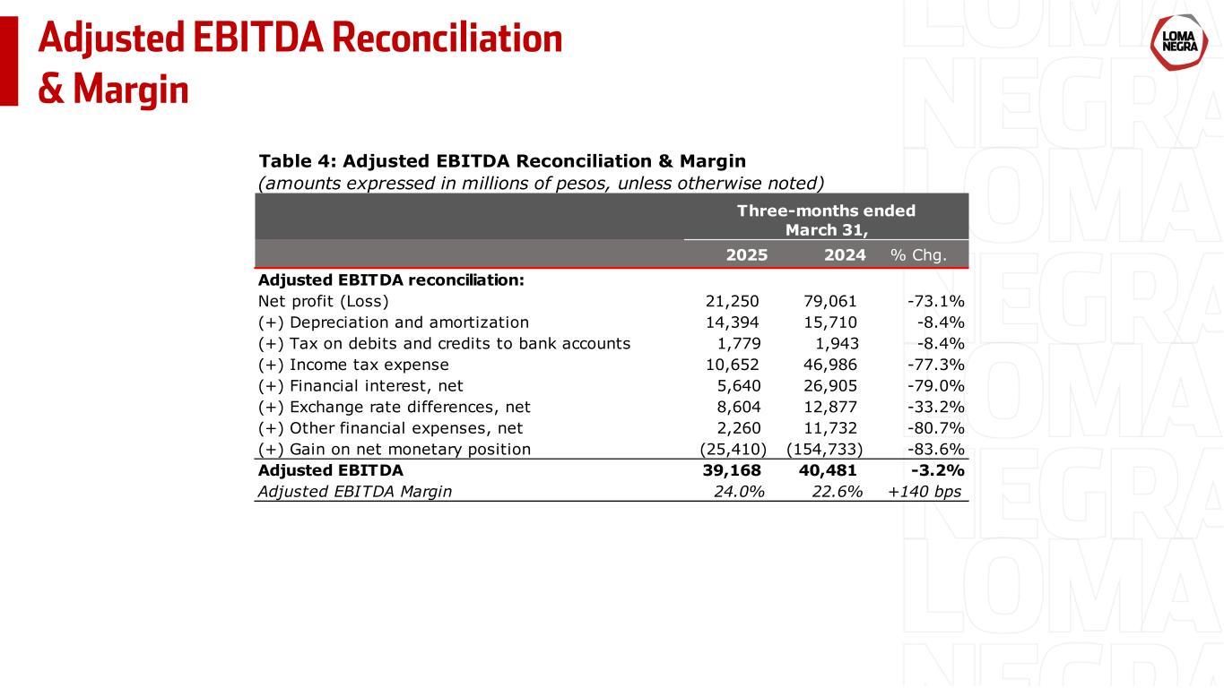 Adjusted EBITDA Reconciliation & Margin Table 4: Adjusted EBITDA Reconciliation & Margin (amounts expressed in millions of pesos, unless otherwise noted) 2025 2024 % Chg. Adjusted EBITDA reconciliation: Net profit (Loss) 21,250 79,061 -73.1% (+) Depreciation and amortization 14,394 15,710 -8.4% (+) Tax on debits and credits to bank accounts 1,779 1,943 -8.4% (+) Income tax expense 10,652 46,986 -77.3% (+) Financial interest, net 5,640 26,905 -79.0% (+) Exchange rate differences, net 8,604 12,877 -33.2% (+) Other financial expenses, net 2,260 11,732 -80.7% (+) Gain on net monetary position (25,410) (154,733) -83.6% Adjusted EBITDA 39,168 40,481 -3.2% Adjusted EBITDA Margin 24.0% 22.6% +140 bps Three-months ended March 31,