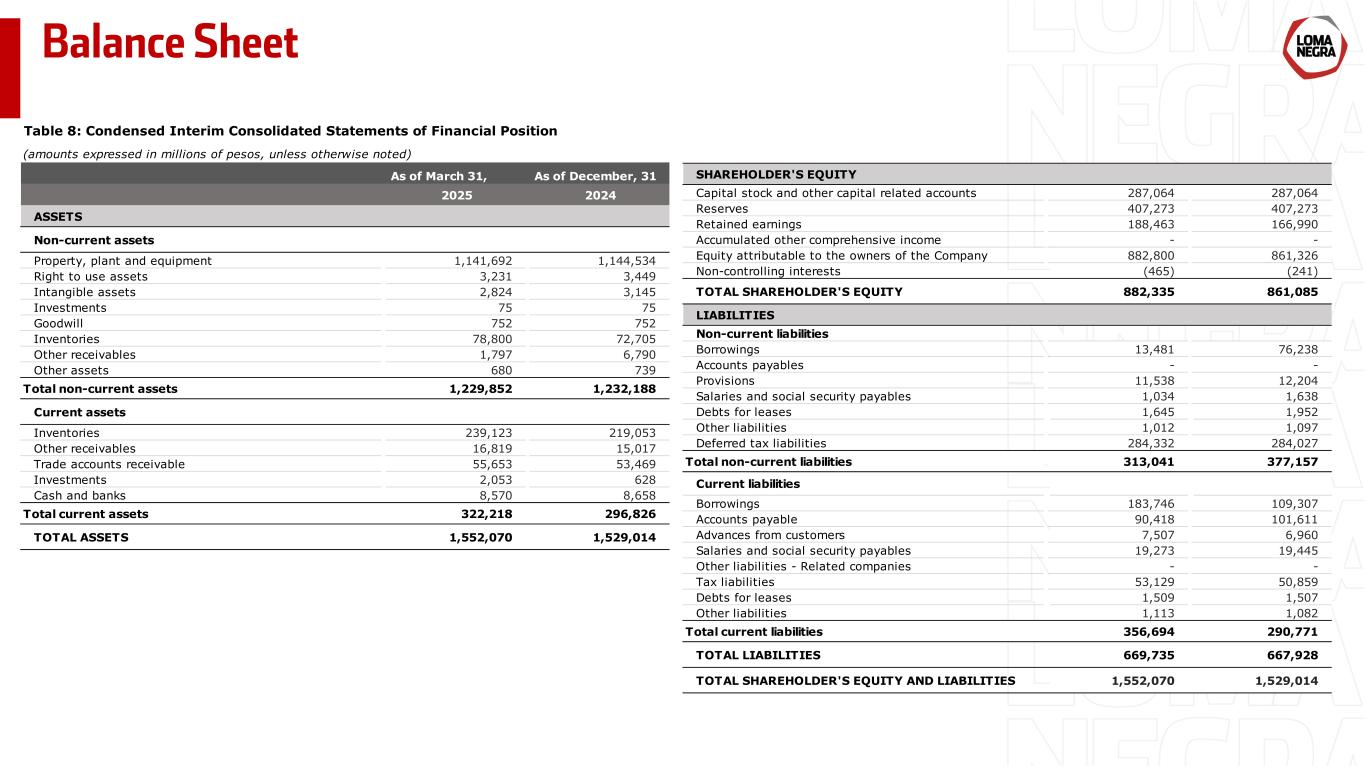Balance Sheet As of March 31, As of December, 31 2025 2024 ASSETS Non-current assets Property, plant and equipment 1,141,692 1,144,534 Right to use assets 3,231 3,449 Intangible assets 2,824 3,145 Investments 75 75 Goodwill 752 752 Inventories 78,800 72,705 Other receivables 1,797 6,790 Other assets 680 739 Total non-current assets 1,229,852 1,232,188 Current assets Inventories 239,123 219,053 Other receivables 16,819 15,017 Trade accounts receivable 55,653 53,469 Investments 2,053 628 Cash and banks 8,570 8,658 Total current assets 322,218 296,826 TOTAL ASSETS 1,552,070 1,529,014 Table 8: Condensed Interim Consolidated Statements of Financial Position (amounts expressed in millions of pesos, unless otherwise noted) SHAREHOLDER'S EQUITY Capital stock and other capital related accounts 287,064 287,064 Reserves 407,273 407,273 Retained earnings 188,463 166,990 Accumulated other comprehensive income - - Equity attributable to the owners of the Company 882,800 861,326 Non-controlling interests (465) (241) TOTAL SHAREHOLDER'S EQUITY 882,335 861,085 LIABILITIES Non-current liabilities Borrowings 13,481 76,238 Accounts payables - - Provisions 11,538 12,204 Salaries and social security payables 1,034 1,638 Debts for leases 1,645 1,952 Other liabilities 1,012 1,097 Deferred tax liabilities 284,332 284,027 Total non-current liabilities 313,041 377,157 Current liabilities Borrowings 183,746 109,307 Accounts payable 90,418 101,611 Advances from customers 7,507 6,960 Salaries and social security payables 19,273 19,445 Other liabilities - Related companies - - Tax liabilities 53,129 50,859 Debts for leases 1,509 1,507 Other liabilities 1,113 1,082 Total current liabilities 356,694 290,771 TOTAL LIABILITIES 669,735 667,928 TOTAL SHAREHOLDER'S EQUITY AND LIABILITIES 1,552,070 1,529,014