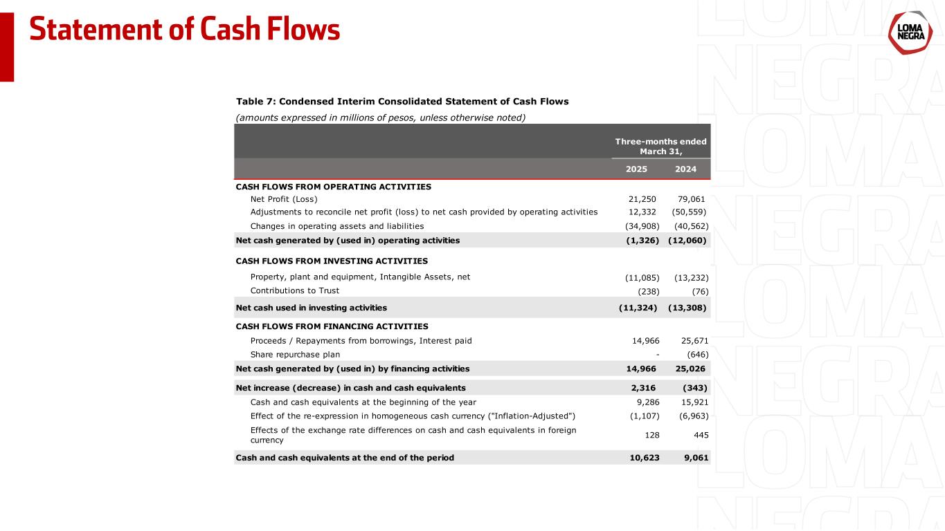 Statement of Cash Flows Table 7: Condensed Interim Consolidated Statement of Cash Flows (amounts expressed in millions of pesos, unless otherwise noted) 2025 2024 CASH FLOWS FROM OPERATING ACTIVITIES Net Profit (Loss) 21,250 79,061 Adjustments to reconcile net profit (loss) to net cash provided by operating activities 12,332 (50,559) Changes in operating assets and liabilities (34,908) (40,562) Net cash generated by (used in) operating activities (1,326) (12,060) CASH FLOWS FROM INVESTING ACTIVITIES Property, plant and equipment, Intangible Assets, net (11,085) (13,232) Contributions to Trust (238) (76) Net cash used in investing activities (11,324) (13,308) CASH FLOWS FROM FINANCING ACTIVITIES Proceeds / Repayments from borrowings, Interest paid 14,966 25,671 Share repurchase plan - (646) Net cash generated by (used in) by financing activities 14,966 25,026 Net increase (decrease) in cash and cash equivalents 2,316 (343) Cash and cash equivalents at the beginning of the year 9,286 15,921 Effect of the re-expression in homogeneous cash currency ("Inflation-Adjusted") (1,107) (6,963) Effects of the exchange rate differences on cash and cash equivalents in foreign currency 128 445 Cash and cash equivalents at the end of the period 10,623 9,061 Three-months ended March 31,