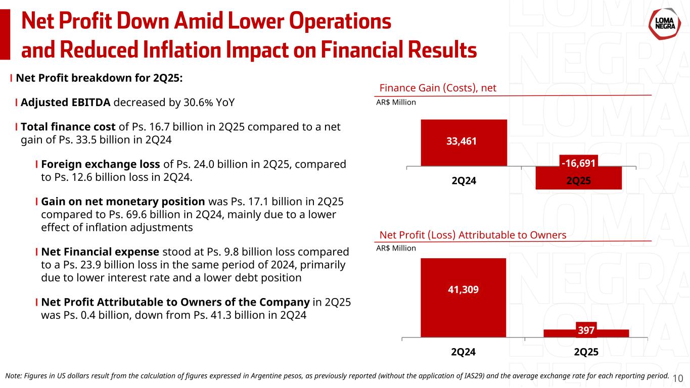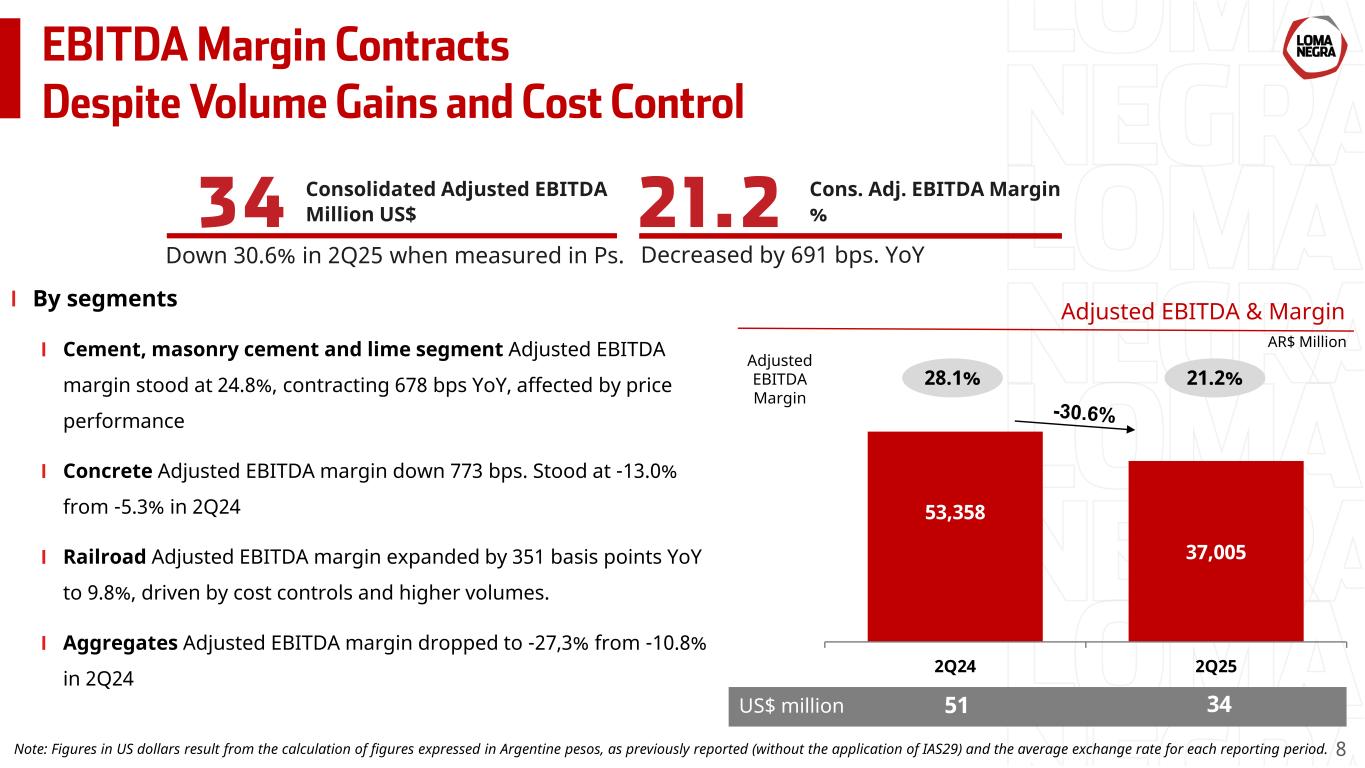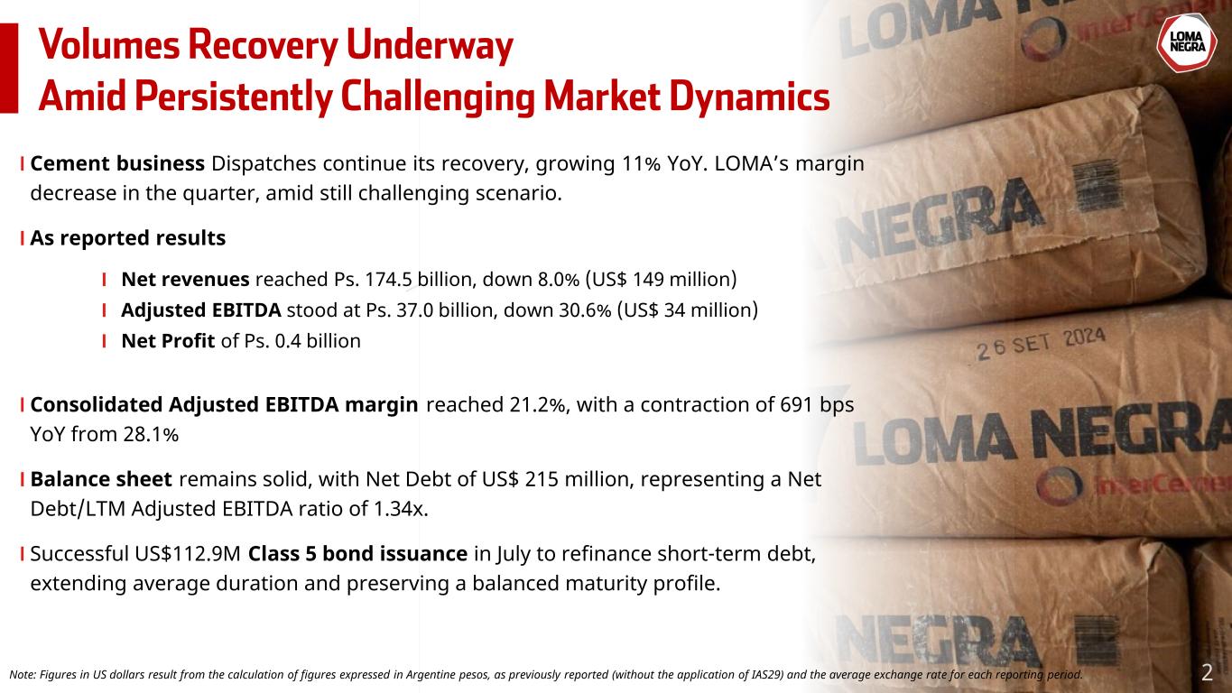 Volumes Recovery Underway Amid Persistently Challenging Market Dynamics Cement business Dispatches continue its recovery, growing 11% YoY. LOMA’s margin decrease in the quarter, amid still challenging scenario. As reported results Net revenues reached Ps. 174.5 billion, down 8.0% (US$ 149 million) Adjusted EBITDA stood at Ps. 37.0 billion, down 30.6% (US$ 34 million) Net Profit of Ps. 0.4 billion Consolidated Adjusted EBITDA margin reached 21.2%, with a contraction of 691 bps YoY from 28.1% Balance sheet remains solid, with Net Debt of US$ 215 million, representing a Net Debt/LTM Adjusted EBITDA ratio of 1.34x. Successful US$112.9M Class 5 bond issuance in July to refinance short-term debt, extending average duration and preserving a balanced maturity profile. Note: Figures in US dollars result from the calculation of figures expressed in Argentine pesos, as previously reported (without the application of IAS29) and the average exchange rate for each reporting period. 2
