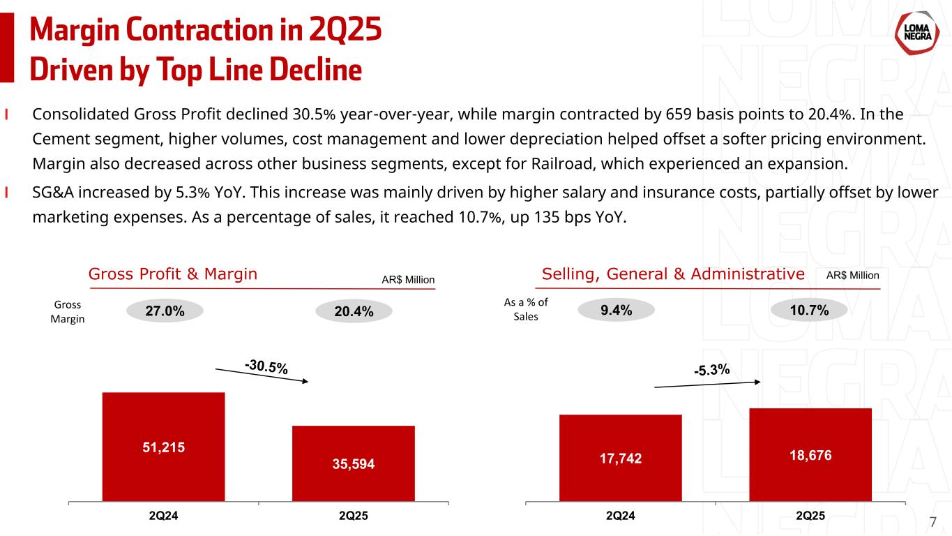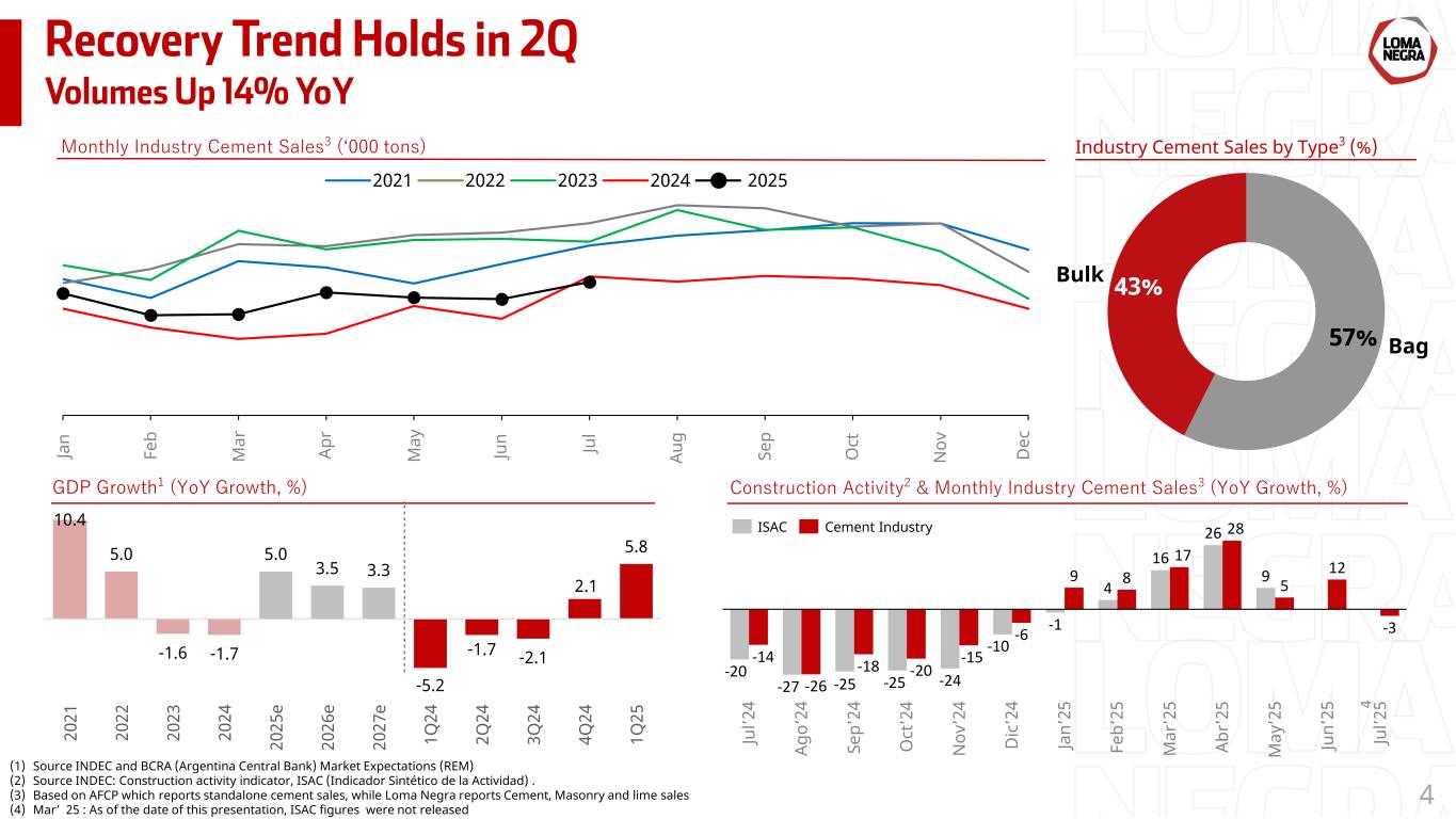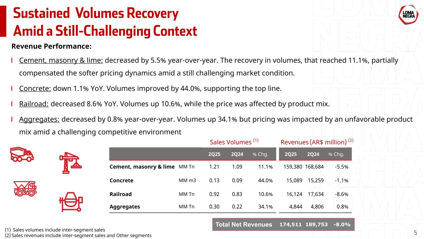 Volumes Recovery Underway Amid Persistently Challenging Market Dynamics Cement business Dispatches continue its recovery, growing 11% YoY. LOMA’s margin decrease in the quarter, amid still challenging scenario. As reported results Net revenues reached Ps. 174.5 billion, down 8.0% (US$ 149 million) Adjusted EBITDA stood at Ps. 37.0 billion, down 30.6% (US$ 34 million) Net Profit of Ps. 0.4 billion Consolidated Adjusted EBITDA margin reached 21.2%, with a contraction of 691 bps YoY from 28.1% Balance sheet remains solid, with Net Debt of US$ 215 million, representing a Net Debt/LTM Adjusted EBITDA ratio of 1.34x. Successful US$112.9M Class 5 bond issuance in July to refinance short-term debt, extending average duration and preserving a balanced maturity profile. Note: Figures in US dollars result from the calculation of figures expressed in Argentine pesos, as previously reported (without the application of IAS29) and the average exchange rate for each reporting period. 2