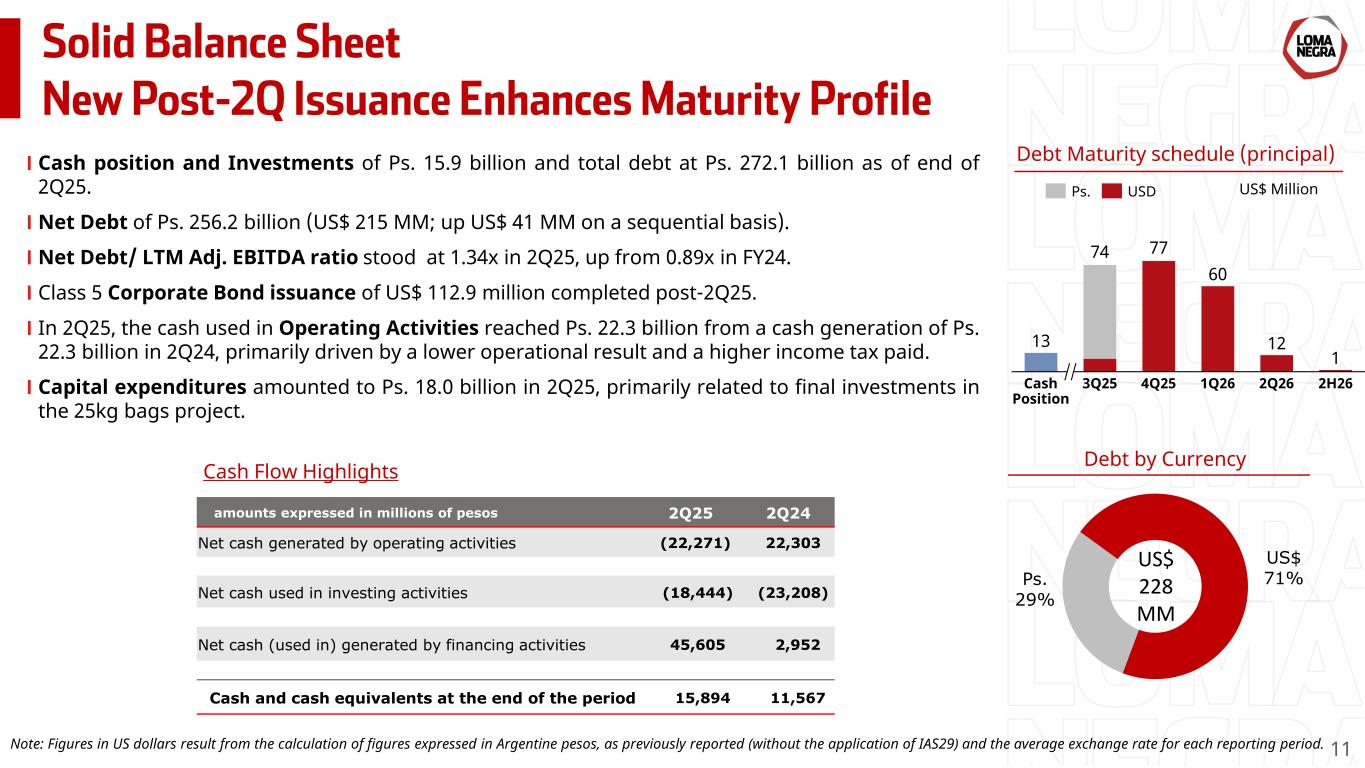 Net Profit breakdown for 2Q25: Adjusted EBITDA decreased by 30.6% YoY Total finance cost of Ps. 16.7 billion in 2Q25 compared to a net gain of Ps. 33.5 billion in 2Q24 Foreign exchange loss of Ps. 24.0 billion in 2Q25, compared to Ps. 12.6 billion loss in 2Q24. Gain on net monetary position was Ps. 17.1 billion in 2Q25 compared to Ps. 69.6 billion in 2Q24, mainly due to a lower effect of inflation adjustments Net Financial expense stood at Ps. 9.8 billion loss compared to a Ps. 23.9 billion loss in the same period of 2024, primarily due to lower interest rate and a lower debt position Net Profit Attributable to Owners of the Company in 2Q25 was Ps. 0.4 billion, down from Ps. 41.3 billion in 2Q24 41,309 397 2Q24 2Q25 Net Profit (Loss) Attributable to Owners AR$ Million 33,461 -16,691 2Q24 2Q25 Finance Gain (Costs), net AR$ Million Note: Figures in US dollars result from the calculation of figures expressed in Argentine pesos, as previously reported (without the application of IAS29) and the average exchange rate for each reporting period. 10 Net Profit Down Amid Lower Operations and Reduced Inflation Impact on Financial Results