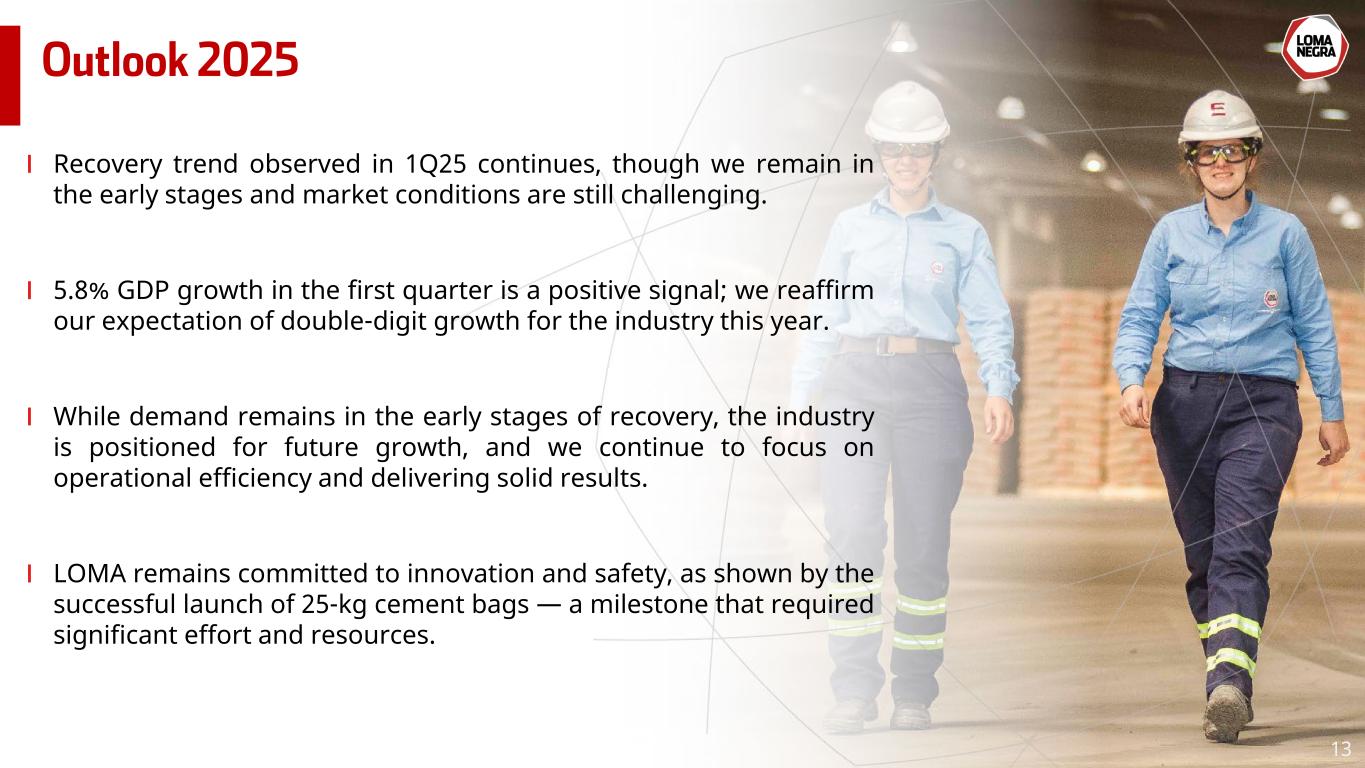 Outlook 2025 Recovery trend observed in 1Q25 continues, though we remain in the early stages and market conditions are still challenging. 5.8% GDP growth in the first quarter is a positive signal; we reaffirm our expectation of double-digit growth for the industry this year. While demand remains in the early stages of recovery, the industry is positioned for future growth, and we continue to focus on operational efficiency and delivering solid results. LOMA remains committed to innovation and safety, as shown by the successful launch of 25-kg cement bags — a milestone that required significant effort and resources. 13