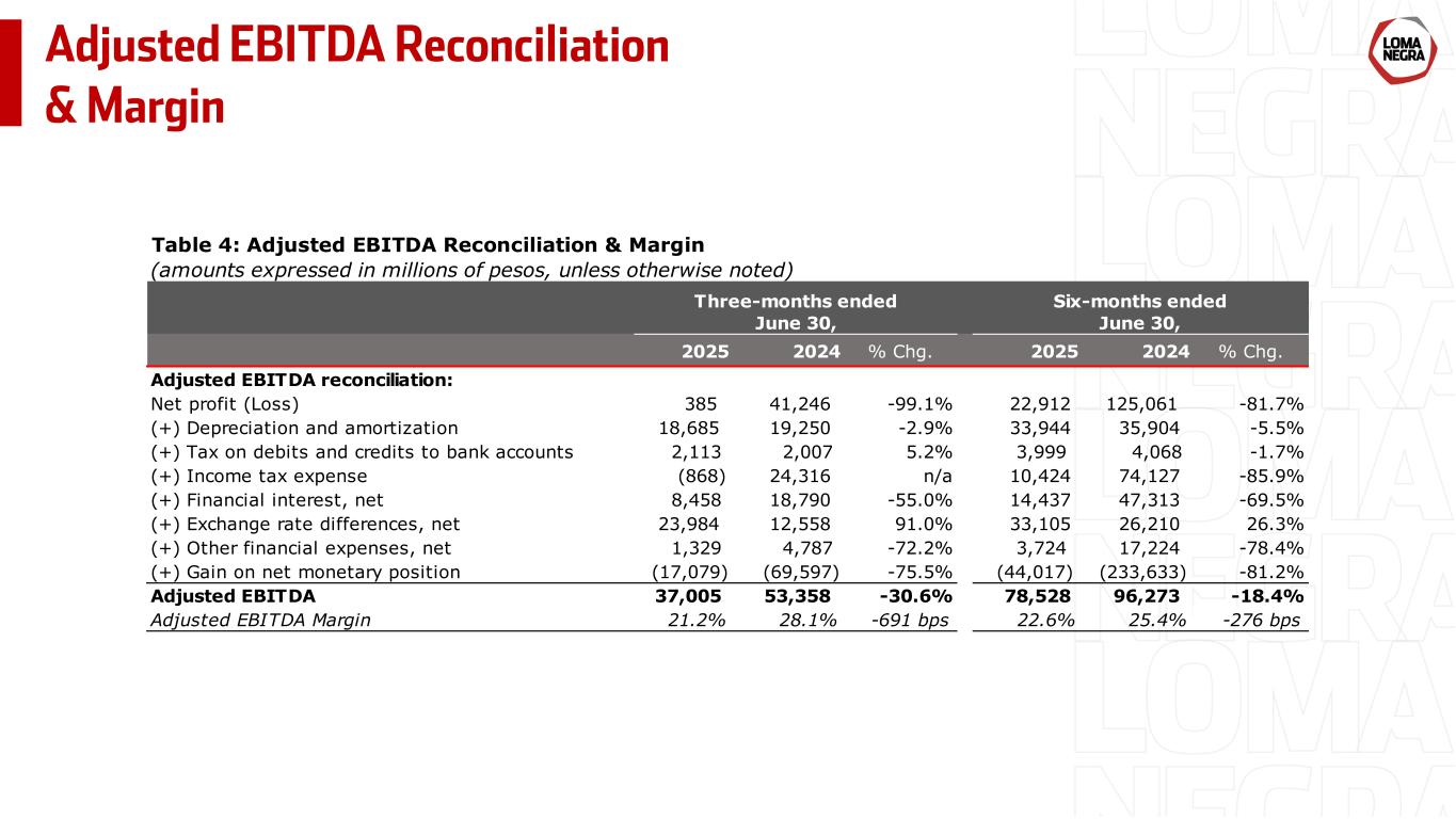 Adjusted EBITDA Reconciliation & Margin Table 4: Adjusted EBITDA Reconciliation & Margin (amounts expressed in millions of pesos, unless otherwise noted) 2025 2024 % Chg. 2025 2024 % Chg. Adjusted EBITDA reconciliation: Net profit (Loss) 385 41,246 -99.1% 22,912 125,061 -81.7% (+) Depreciation and amortization 18,685 19,250 -2.9% 33,944 35,904 -5.5% (+) Tax on debits and credits to bank accounts 2,113 2,007 5.2% 3,999 4,068 -1.7% (+) Income tax expense (868) 24,316 n/a 10,424 74,127 -85.9% (+) Financial interest, net 8,458 18,790 -55.0% 14,437 47,313 -69.5% (+) Exchange rate differences, net 23,984 12,558 91.0% 33,105 26,210 26.3% (+) Other financial expenses, net 1,329 4,787 -72.2% 3,724 17,224 -78.4% (+) Gain on net monetary position (17,079) (69,597) -75.5% (44,017) (233,633) -81.2% Adjusted EBITDA 37,005 53,358 -30.6% 78,528 96,273 -18.4% Adjusted EBITDA Margin 21.2% 28.1% -691 bps 22.6% 25.4% -276 bps Three-months ended June 30, Six-months ended June 30,