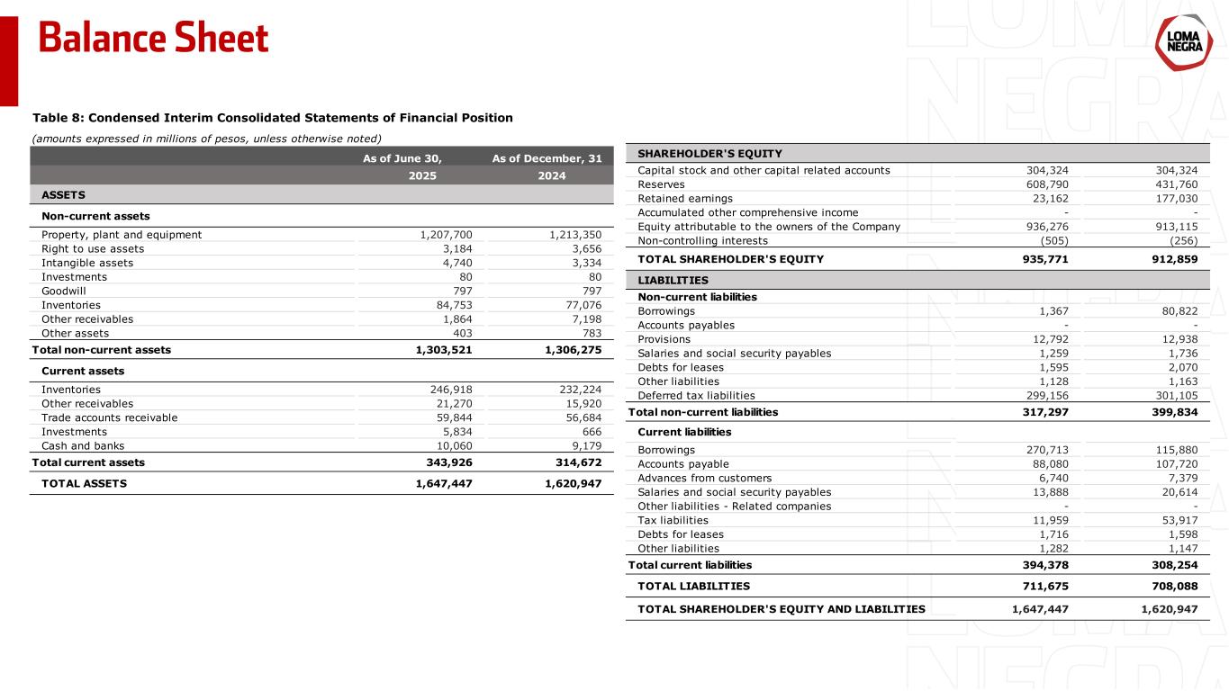 Balance Sheet As of June 30, As of December, 31 2025 2024 ASSETS Non-current assets Property, plant and equipment 1,207,700 1,213,350 Right to use assets 3,184 3,656 Intangible assets 4,740 3,334 Investments 80 80 Goodwill 797 797 Inventories 84,753 77,076 Other receivables 1,864 7,198 Other assets 403 783 Total non-current assets 1,303,521 1,306,275 Current assets Inventories 246,918 232,224 Other receivables 21,270 15,920 Trade accounts receivable 59,844 56,684 Investments 5,834 666 Cash and banks 10,060 9,179 Total current assets 343,926 314,672 TOTAL ASSETS 1,647,447 1,620,947 Table 8: Condensed Interim Consolidated Statements of Financial Position (amounts expressed in millions of pesos, unless otherwise noted) SHAREHOLDER'S EQUITY Capital stock and other capital related accounts 304,324 304,324 Reserves 608,790 431,760 Retained earnings 23,162 177,030 Accumulated other comprehensive income - - Equity attributable to the owners of the Company 936,276 913,115 Non-controlling interests (505) (256) TOTAL SHAREHOLDER'S EQUITY 935,771 912,859 LIABILITIES Non-current liabilities Borrowings 1,367 80,822 Accounts payables - - Provisions 12,792 12,938 Salaries and social security payables 1,259 1,736 Debts for leases 1,595 2,070 Other liabilities 1,128 1,163 Deferred tax liabilities 299,156 301,105 Total non-current liabilities 317,297 399,834 Current liabilities Borrowings 270,713 115,880 Accounts payable 88,080 107,720 Advances from customers 6,740 7,379 Salaries and social security payables 13,888 20,614 Other liabilities - Related companies - - Tax liabilities 11,959 53,917 Debts for leases 1,716 1,598 Other liabilities 1,282 1,147 Total current liabilities 394,378 308,254 TOTAL LIABILITIES 711,675 708,088 TOTAL SHAREHOLDER'S EQUITY AND LIABILITIES 1,647,447 1,620,947