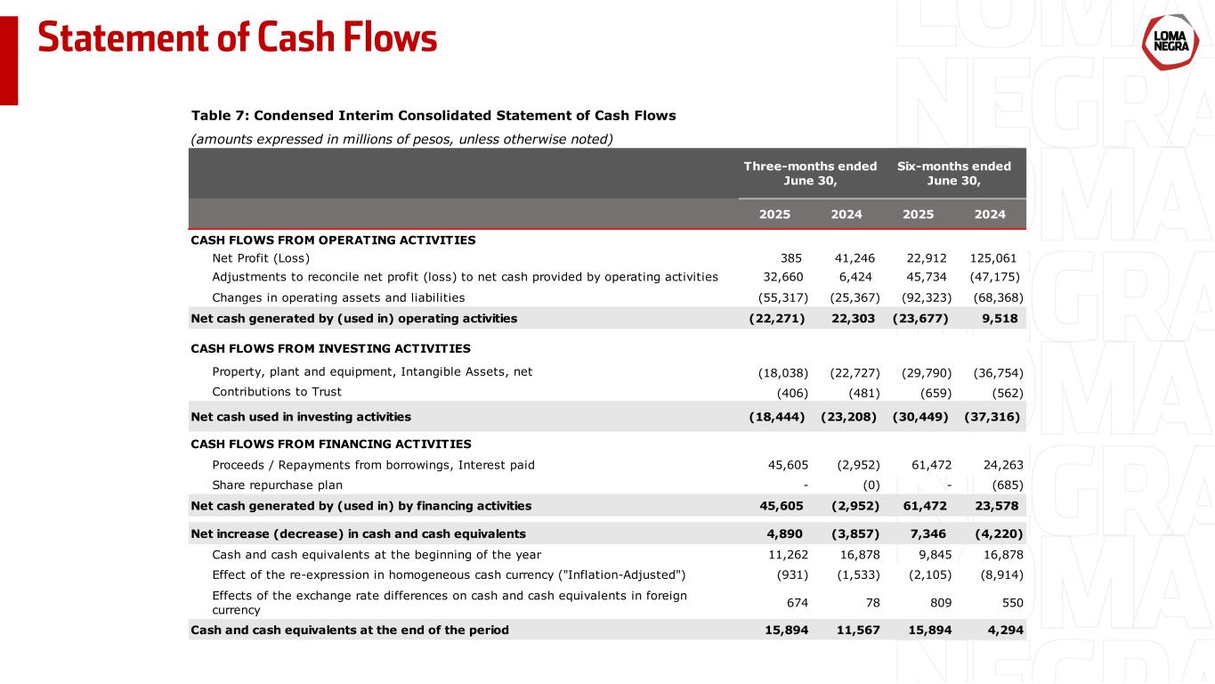 Statement of Cash Flows Table 7: Condensed Interim Consolidated Statement of Cash Flows (amounts expressed in millions of pesos, unless otherwise noted) 2025 2024 2025 2024 CASH FLOWS FROM OPERATING ACTIVITIES Net Profit (Loss) 385 41,246 22,912 125,061 Adjustments to reconcile net profit (loss) to net cash provided by operating activities 32,660 6,424 45,734 (47,175) Changes in operating assets and liabilities (55,317) (25,367) (92,323) (68,368) Net cash generated by (used in) operating activities (22,271) 22,303 (23,677) 9,518 CASH FLOWS FROM INVESTING ACTIVITIES Property, plant and equipment, Intangible Assets, net (18,038) (22,727) (29,790) (36,754) Contributions to Trust (406) (481) (659) (562) Net cash used in investing activities (18,444) (23,208) (30,449) (37,316) CASH FLOWS FROM FINANCING ACTIVITIES Proceeds / Repayments from borrowings, Interest paid 45,605 (2,952) 61,472 24,263 Share repurchase plan - (0) - (685) Net cash generated by (used in) by financing activities 45,605 (2,952) 61,472 23,578 Net increase (decrease) in cash and cash equivalents 4,890 (3,857) 7,346 (4,220) Cash and cash equivalents at the beginning of the year 11,262 16,878 9,845 16,878 Effect of the re-expression in homogeneous cash currency ("Inflation-Adjusted") (931) (1,533) (2,105) (8,914) Effects of the exchange rate differences on cash and cash equivalents in foreign currency 674 78 809 550 Cash and cash equivalents at the end of the period 15,894 11,567 15,894 4,294 Six-months ended June 30, Three-months ended June 30,