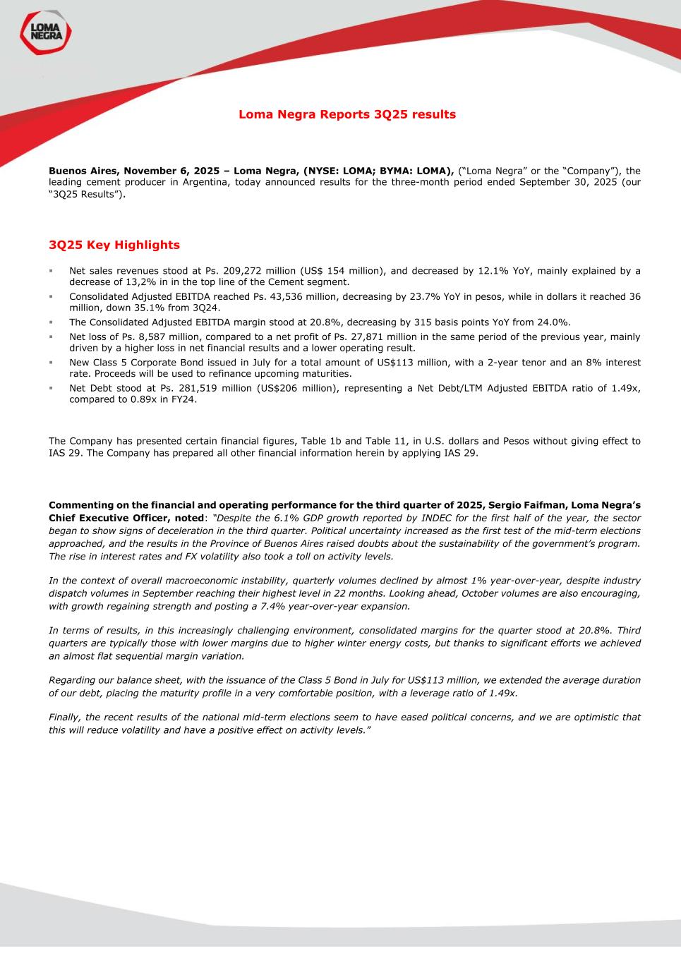 Loma Negra Reports 3Q25 results Buenos Aires, November 6, 2025 – Loma Negra, (NYSE: LOMA; BYMA: LOMA), (“Loma Negra” or the “Company”), the leading cement producer in Argentina, today announced results for the three-month period ended September 30, 2025 (our “3Q25 Results”). 3Q25 Key Highlights  Net sales revenues stood at Ps. 209,272 million (US$ 154 million), and decreased by 12.1% YoY, mainly explained by a decrease of 13,2% in in the top line of the Cement segment.  Consolidated Adjusted EBITDA reached Ps. 43,536 million, decreasing by 23.7% YoY in pesos, while in dollars it reached 36 million, down 35.1% from 3Q24.  The Consolidated Adjusted EBITDA margin stood at 20.8%, decreasing by 315 basis points YoY from 24.0%.  Net loss of Ps. 8,587 million, compared to a net profit of Ps. 27,871 million in the same period of the previous year, mainly driven by a higher loss in net financial results and a lower operating result.  New Class 5 Corporate Bond issued in July for a total amount of US$113 million, with a 2-year tenor and an 8% interest rate. Proceeds will be used to refinance upcoming maturities.  Net Debt stood at Ps. 281,519 million (US$206 million), representing a Net Debt/LTM Adjusted EBITDA ratio of 1.49x, compared to 0.89x in FY24. The Company has presented certain financial figures, Table 1b and Table 11, in U.S. dollars and Pesos without giving effect to IAS 29. The Company has prepared all other financial information herein by applying IAS 29. Commenting on the financial and operating performance for the third quarter of 2025, Sergio Faifman, Loma Negra’s Chief Executive Officer, noted: “Despite the 6.1% GDP growth reported by INDEC for the first half of the year, the sector began to show signs of deceleration in the third quarter. Political uncertainty increased as the first test of the mid-term elections approached, and the results in the Province of Buenos Aires raised doubts about the sustainability of the government’s program. The rise in interest rates and FX volatility also took a toll on activity levels. In the context of overall macroeconomic instability, quarterly volumes declined by almost 1% year-over-year, despite industry dispatch volumes in September reaching their highest level in 22 months. Looking ahead, October volumes are also encouraging, with growth regaining strength and posting a 7.4% year-over-year expansion. In terms of results, in this increasingly challenging environment, consolidated margins for the quarter stood at 20.8%. Third quarters are typically those with lower margins due to higher winter energy costs, but thanks to significant efforts we achieved an almost flat sequential margin variation. Regarding our balance sheet, with the issuance of the Class 5 Bond in July for US$113 million, we extended the average duration of our debt, placing the maturity profile in a very comfortable position, with a leverage ratio of 1.49x. Finally, the recent results of the national mid-term elections seem to have eased political concerns, and we are optimistic that this will reduce volatility and have a positive effect on activity levels.”