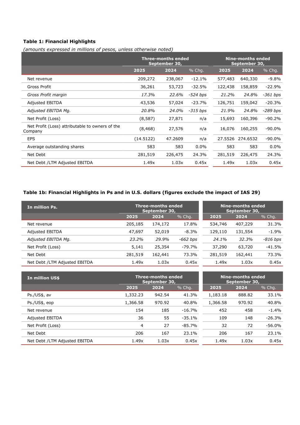 Table 1: Financial Highlights (amounts expressed in millions of pesos, unless otherwise noted) Three-months ended September 30, Nine-months ended September 30, 2025 2024 % Chg. 2025 2024 % Chg. Net revenue 209,272 238,067 -12.1% 577,483 640,330 -9.8% Gross Profit 36,261 53,723 -32.5% 122,438 158,859 -22.9% Gross Profit margin 17.3% 22.6% -524 bps 21.2% 24.8% -361 bps Adjusted EBITDA 43,536 57,024 -23.7% 126,751 159,042 -20.3% Adjusted EBITDA Mg. 20.8% 24.0% -315 bps 21.9% 24.8% -289 bps Net Profit (Loss) (8,587) 27,871 n/a 15,693 160,396 -90.2% Net Profit (Loss) attributable to owners of the Company (8,468) 27,576 n/a 16,076 160,255 -90.0% EPS (14.5122) 47.2609 n/a 27.5526 274.6532 -90.0% Average outstanding shares 583 583 0.0% 583 583 0.0% Net Debt 281,519 226,475 24.3% 281,519 226,475 24.3% Net Debt /LTM Adjusted EBITDA 1.49x 1.03x 0.45x 1.49x 1.03x 0.45x Table 1b: Financial Highlights in Ps and in U.S. dollars (figures exclude the impact of IAS 29) In million Ps. Three-months ended September 30, Nine-months ended September 30, 2025 2024 % Chg. 2025 2024 % Chg. Net revenue 205,185 174,172 17.8% 534,746 407,229 31.3% Adjusted EBITDA 47,697 52,019 -8.3% 129,110 131,554 -1.9% Adjusted EBITDA Mg. 23.2% 29.9% -662 bps 24.1% 32.3% -816 bps Net Profit (Loss) 5,141 25,354 -79.7% 37,290 63,720 -41.5% Net Debt 281,519 162,441 73.3% 281,519 162,441 73.3% Net Debt /LTM Adjusted EBITDA 1.49x 1.03x 0.45x 1.49x 1.03x 0.45x In million US$ Three-months ended September 30, Nine-months ended September 30, 2025 2024 % Chg. 2025 2024 % Chg. Ps./US$, av 1,332.23 942.54 41.3% 1,183.18 888.82 33.1% Ps./US$, eop 1,366.58 970.92 40.8% 1,366.58 970.92 40.8% Net revenue 154 185 -16.7% 452 458 -1.4% Adjusted EBITDA 36 55 -35.1% 109 148 -26.3% Net Profit (Loss) 4 27 -85.7% 32 72 -56.0% Net Debt 206 167 23.1% 206 167 23.1% Net Debt /LTM Adjusted EBITDA 1.49x 1.03x 0.45x 1.49x 1.03x 0.45x