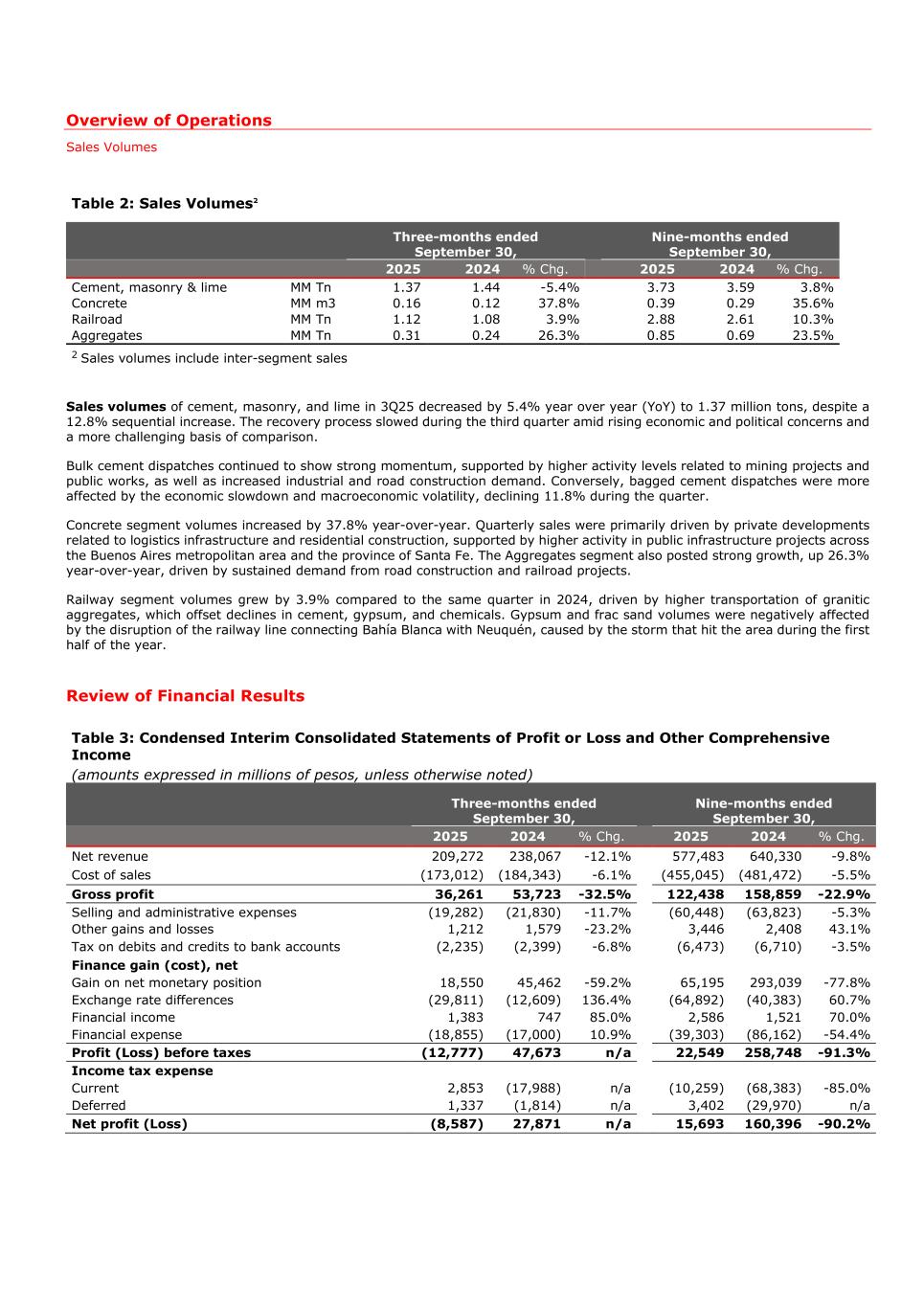 Overview of Operations Sales Volumes Table 2: Sales Volumes2 Three-months ended September 30, Nine-months ended September 30, 2025 2024 % Chg. 2025 2024 % Chg. Cement, masonry & lime MM Tn 1.37 1.44 -5.4% 3.73 3.59 3.8% Concrete MM m3 0.16 0.12 37.8% 0.39 0.29 35.6% Railroad MM Tn 1.12 1.08 3.9% 2.88 2.61 10.3% Aggregates MM Tn 0.31 0.24 26.3% 0.85 0.69 23.5% 2 Sales volumes include inter-segment sales Sales volumes of cement, masonry, and lime in 3Q25 decreased by 5.4% year over year (YoY) to 1.37 million tons, despite a 12.8% sequential increase. The recovery process slowed during the third quarter amid rising economic and political concerns and a more challenging basis of comparison. Bulk cement dispatches continued to show strong momentum, supported by higher activity levels related to mining projects and public works, as well as increased industrial and road construction demand. Conversely, bagged cement dispatches were more affected by the economic slowdown and macroeconomic volatility, declining 11.8% during the quarter. Concrete segment volumes increased by 37.8% year-over-year. Quarterly sales were primarily driven by private developments related to logistics infrastructure and residential construction, supported by higher activity in public infrastructure projects across the Buenos Aires metropolitan area and the province of Santa Fe. The Aggregates segment also posted strong growth, up 26.3% year-over-year, driven by sustained demand from road construction and railroad projects. Railway segment volumes grew by 3.9% compared to the same quarter in 2024, driven by higher transportation of granitic aggregates, which offset declines in cement, gypsum, and chemicals. Gypsum and frac sand volumes were negatively affected by the disruption of the railway line connecting Bahía Blanca with Neuquén, caused by the storm that hit the area during the first half of the year. Review of Financial Results Table 3: Condensed Interim Consolidated Statements of Profit or Loss and Other Comprehensive Income (amounts expressed in millions of pesos, unless otherwise noted) Three-months ended September 30, Nine-months ended September 30, 2025 2024 % Chg. 2025 2024 % Chg. Net revenue 209,272 238,067 -12.1% 577,483 640,330 -9.8% Cost of sales (173,012) (184,343) -6.1% (455,045) (481,472) -5.5% Gross profit 36,261 53,723 -32.5% 122,438 158,859 -22.9% Selling and administrative expenses (19,282) (21,830) -11.7% (60,448) (63,823) -5.3% Other gains and losses 1,212 1,579 -23.2% 3,446 2,408 43.1% Tax on debits and credits to bank accounts (2,235) (2,399) -6.8% (6,473) (6,710) -3.5% Finance gain (cost), net Gain on net monetary position 18,550 45,462 -59.2% 65,195 293,039 -77.8% Exchange rate differences (29,811) (12,609) 136.4% (64,892) (40,383) 60.7% Financial income 1,383 747 85.0% 2,586 1,521 70.0% Financial expense (18,855) (17,000) 10.9% (39,303) (86,162) -54.4% Profit (Loss) before taxes (12,777) 47,673 n/a 22,549 258,748 -91.3% Income tax expense Current 2,853 (17,988) n/a (10,259) (68,383) -85.0% Deferred 1,337 (1,814) n/a 3,402 (29,970) n/a Net profit (Loss) (8,587) 27,871 n/a 15,693 160,396 -90.2%