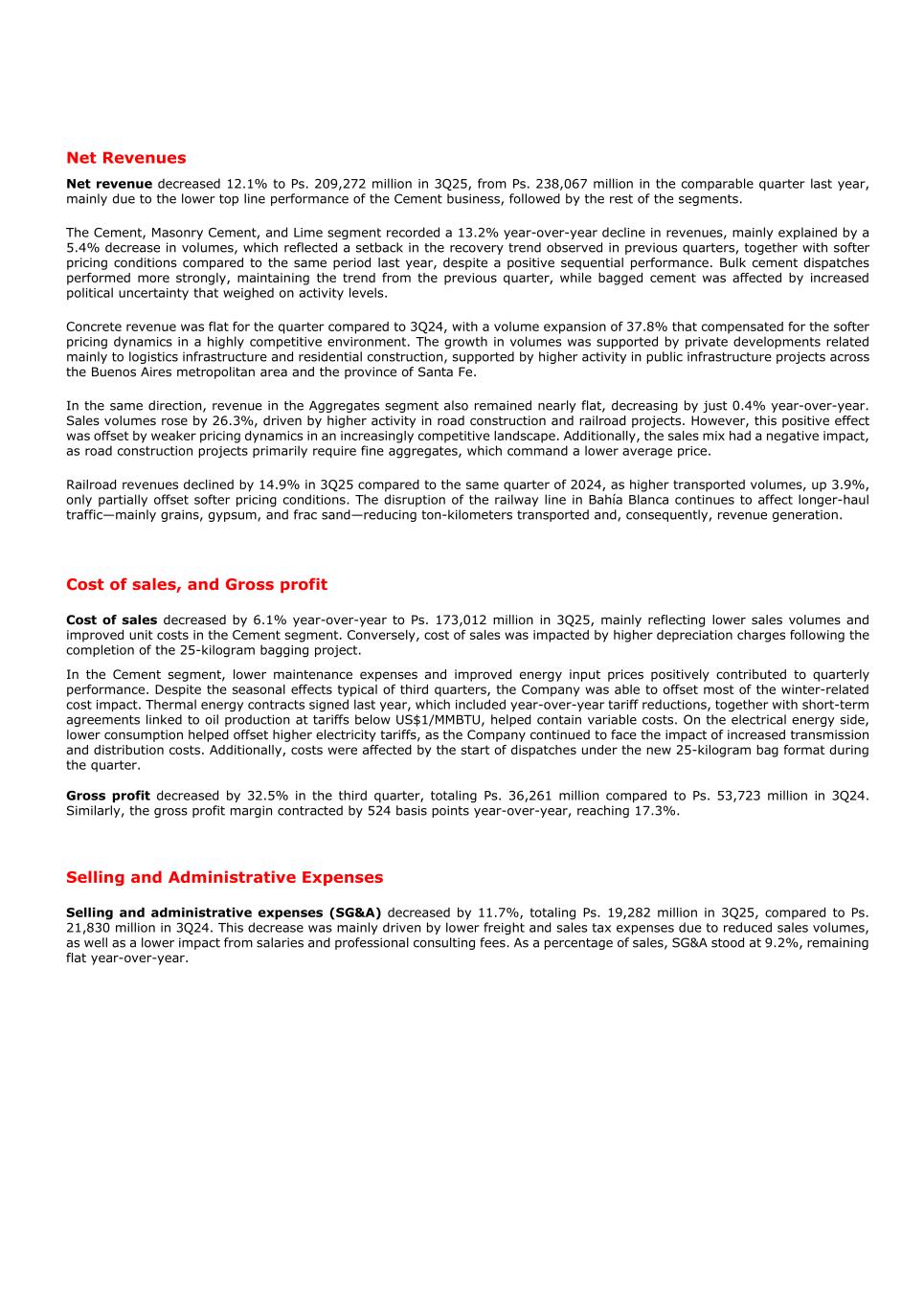 Net Revenues Net revenue decreased 12.1% to Ps. 209,272 million in 3Q25, from Ps. 238,067 million in the comparable quarter last year, mainly due to the lower top line performance of the Cement business, followed by the rest of the segments. The Cement, Masonry Cement, and Lime segment recorded a 13.2% year-over-year decline in revenues, mainly explained by a 5.4% decrease in volumes, which reflected a setback in the recovery trend observed in previous quarters, together with softer pricing conditions compared to the same period last year, despite a positive sequential performance. Bulk cement dispatches performed more strongly, maintaining the trend from the previous quarter, while bagged cement was affected by increased political uncertainty that weighed on activity levels. Concrete revenue was flat for the quarter compared to 3Q24, with a volume expansion of 37.8% that compensated for the softer pricing dynamics in a highly competitive environment. The growth in volumes was supported by private developments related mainly to logistics infrastructure and residential construction, supported by higher activity in public infrastructure projects across the Buenos Aires metropolitan area and the province of Santa Fe. In the same direction, revenue in the Aggregates segment also remained nearly flat, decreasing by just 0.4% year-over-year. Sales volumes rose by 26.3%, driven by higher activity in road construction and railroad projects. However, this positive effect was offset by weaker pricing dynamics in an increasingly competitive landscape. Additionally, the sales mix had a negative impact, as road construction projects primarily require fine aggregates, which command a lower average price. Railroad revenues declined by 14.9% in 3Q25 compared to the same quarter of 2024, as higher transported volumes, up 3.9%, only partially offset softer pricing conditions. The disruption of the railway line in Bahía Blanca continues to affect longer-haul traffic—mainly grains, gypsum, and frac sand—reducing ton-kilometers transported and, consequently, revenue generation. Cost of sales, and Gross profit Cost of sales decreased by 6.1% year-over-year to Ps. 173,012 million in 3Q25, mainly reflecting lower sales volumes and improved unit costs in the Cement segment. Conversely, cost of sales was impacted by higher depreciation charges following the completion of the 25-kilogram bagging project. In the Cement segment, lower maintenance expenses and improved energy input prices positively contributed to quarterly performance. Despite the seasonal effects typical of third quarters, the Company was able to offset most of the winter-related cost impact. Thermal energy contracts signed last year, which included year-over-year tariff reductions, together with short-term agreements linked to oil production at tariffs below US$1/MMBTU, helped contain variable costs. On the electrical energy side, lower consumption helped offset higher electricity tariffs, as the Company continued to face the impact of increased transmission and distribution costs. Additionally, costs were affected by the start of dispatches under the new 25-kilogram bag format during the quarter. Gross profit decreased by 32.5% in the third quarter, totaling Ps. 36,261 million compared to Ps. 53,723 million in 3Q24. Similarly, the gross profit margin contracted by 524 basis points year-over-year, reaching 17.3%. Selling and Administrative Expenses Selling and administrative expenses (SG&A) decreased by 11.7%, totaling Ps. 19,282 million in 3Q25, compared to Ps. 21,830 million in 3Q24. This decrease was mainly driven by lower freight and sales tax expenses due to reduced sales volumes, as well as a lower impact from salaries and professional consulting fees. As a percentage of sales, SG&A stood at 9.2%, remaining flat year-over-year.