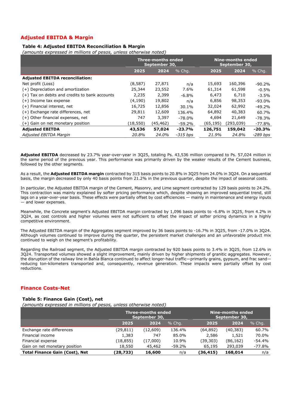 Adjusted EBITDA & Margin Table 4: Adjusted EBITDA Reconciliation & Margin (amounts expressed in millions of pesos, unless otherwise noted) Three-months ended September 30, Nine-months ended September 30, 2025 2024 % Chg. 2025 2024 % Chg. Adjusted EBITDA reconciliation: Net profit (Loss) (8,587) 27,871 n/a 15,693 160,396 -90.2% (+) Depreciation and amortization 25,344 23,552 7.6% 61,314 61,598 -0.5% (+) Tax on debits and credits to bank accounts 2,235 2,399 -6.8% 6,473 6,710 -3.5% (+) Income tax expense (4,190) 19,802 n/a 6,856 98,353 -93.0% (+) Financial interest, net 16,725 12,856 30.1% 32,024 62,992 -49.2% (+) Exchange rate differences, net 29,811 12,609 136.4% 64,892 40,383 60.7% (+) Other financial expenses, net 747 3,397 -78.0% 4,694 21,649 -78.3% (+) Gain on net monetary position (18,550) (45,462) -59.2% (65,195) (293,039) -77.8% Adjusted EBITDA 43,536 57,024 -23.7% 126,751 159,042 -20.3% Adjusted EBITDA Margin 20.8% 24.0% -315 bps 21.9% 24.8% -289 bps Adjusted EBITDA decreased by 23.7% year-over-year in 3Q25, totaling Ps. 43,536 million compared to Ps. 57,024 million in the same period of the previous year. This performance was primarily driven by the weaker results of the Cement business, followed by the other segments. As a result, the Adjusted EBITDA margin contracted by 315 basis points to 20.8% in 3Q25 from 24.0% in 3Q24. On a sequential basis, the margin decreased by only 40 basis points from 21.2% in the previous quarter, despite the impact of seasonal costs. In particular, the Adjusted EBITDA margin of the Cement, Masonry, and Lime segment contracted by 129 basis points to 24.2%. This contraction was mainly explained by softer pricing performance which, despite showing an improved sequential trend, still lags on a year-over-year basis. These effects were partially offset by cost efficiencies — mainly in maintenance and energy inputs — and lower expenses. Meanwhile, the Concrete segment’s Adjusted EBITDA margin contracted by 1,096 basis points to -6.8% in 3Q25, from 4.2% in 3Q24, as cost controls and higher volumes were not sufficient to offset the impact of softer pricing dynamics in a highly competitive environment. The Adjusted EBITDA margin of the Aggregates segment improved by 36 basis points to -16.7% in 3Q25, from -17.0% in 3Q24. Although volumes continued to improve during the quarter, the persistent market challenges and an unfavorable product mix continued to weigh on the segment’s profitability. Regarding the Railroad segment, the Adjusted EBITDA margin contracted by 920 basis points to 3.4% in 3Q25, from 12.6% in 3Q24. Transported volumes showed a slight improvement, mainly driven by higher shipments of granitic aggregates. However, the disruption of the railway line in Bahía Blanca continued to affect longer-haul traffic—primarily grains, gypsum, and frac sand— reducing ton-kilometers transported and, consequently, revenue generation. These impacts were partially offset by cost reductions. Finance Costs-Net Table 5: Finance Gain (Cost), net (amounts expressed in millions of pesos, unless otherwise noted) Three-months ended September 30, Nine-months ended September 30, 2025 2024 % Chg. 2025 2024 % Chg. Exchange rate differences (29,811) (12,609) 136.4% (64,892) (40,383) 60.7% Financial income 1,383 747 85.0% 2,586 1,521 70.0% Financial expense (18,855) (17,000) 10.9% (39,303) (86,162) -54.4% Gain on net monetary position 18,550 45,462 -59.2% 65,195 293,039 -77.8% Total Finance Gain (Cost), Net (28,733) 16,600 n/a (36,415) 168,014 n/a