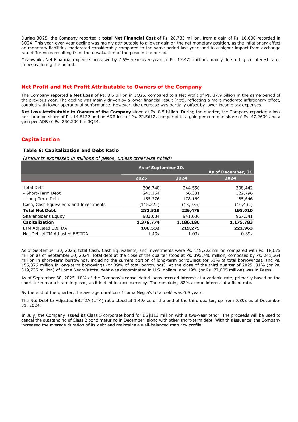 During 3Q25, the Company reported a total Net Financial Cost of Ps. 28,733 million, from a gain of Ps. 16,600 recorded in 3Q24. This year-over-year decline was mainly attributable to a lower gain on the net monetary position, as the inflationary effect on monetary liabilities moderated considerably compared to the same period last year, and to a higher impact from exchange rate differences resulting from the devaluation of the peso in the period. Meanwhile, Net Financial expense increased by 7.5% year-over-year, to Ps. 17,472 million, mainly due to higher interest rates in pesos during the period. Net Profit and Net Profit Attributable to Owners of the Company The Company reported a Net Loss of Ps. 8.6 billion in 3Q25, compared to a Net Profit of Ps. 27.9 billion in the same period of the previous year. The decline was mainly driven by a lower financial result (net), reflecting a more moderate inflationary effect, coupled with lower operational performance. However, the decrease was partially offset by lower income tax expenses. Net Loss Attributable to Owners of the Company stood at Ps. 8.5 billion. During the quarter, the Company reported a loss per common share of Ps. 14.5122 and an ADR loss of Ps. 72.5612, compared to a gain per common share of Ps. 47.2609 and a gain per ADR of Ps. 236.3044 in 3Q24. Capitalization Table 6: Capitalization and Debt Ratio (amounts expressed in millions of pesos, unless otherwise noted) As of September 30, As of December, 31 2025 2024 2024 Total Debt 396,740 244,550 208,442 - Short-Term Debt 241,364 66,381 122,796 - Long-Term Debt 155,376 178,169 85,646 Cash, Cash Equivalents and Investments (115,222) (18,075) (10,432) Total Net Debt 281,519 226,475 198,010 Shareholder's Equity 983,034 941,636 967,341 Capitalization 1,379,774 1,186,186 1,175,783 LTM Adjusted EBITDA 188,532 219,275 222,963 Net Debt /LTM Adjusted EBITDA 1.49x 1.03x 0.89x As of September 30, 2025, total Cash, Cash Equivalents, and Investments were Ps. 115,222 million compared with Ps. 18,075 million as of September 30, 2024. Total debt at the close of the quarter stood at Ps. 396,740 million, composed by Ps. 241,364 million in short-term borrowings, including the current portion of long-term borrowings (or 61% of total borrowings), and Ps. 155,376 million in long-term borrowings (or 39% of total borrowings). At the close of the third quarter of 2025, 81% (or Ps. 319,735 million) of Loma Negra’s total debt was denominated in U.S. dollars, and 19% (or Ps. 77,005 million) was in Pesos. As of September 30, 2025, 18% of the Company's consolidated loans accrued interest at a variable rate, primarily based on the short-term market rate in pesos, as it is debt in local currency. The remaining 82% accrue interest at a fixed rate. By the end of the quarter, the average duration of Loma Negra’s total debt was 0.9 years. The Net Debt to Adjusted EBITDA (LTM) ratio stood at 1.49x as of the end of the third quarter, up from 0.89x as of December 31, 2024. In July, the Company issued its Class 5 corporate bond for US$113 million with a two-year tenor. The proceeds will be used to cancel the outstanding of Class 2 bond maturing in December, along with other short-term debt. With this issuance, the Company increased the average duration of its debt and maintains a well-balanced maturity profile.