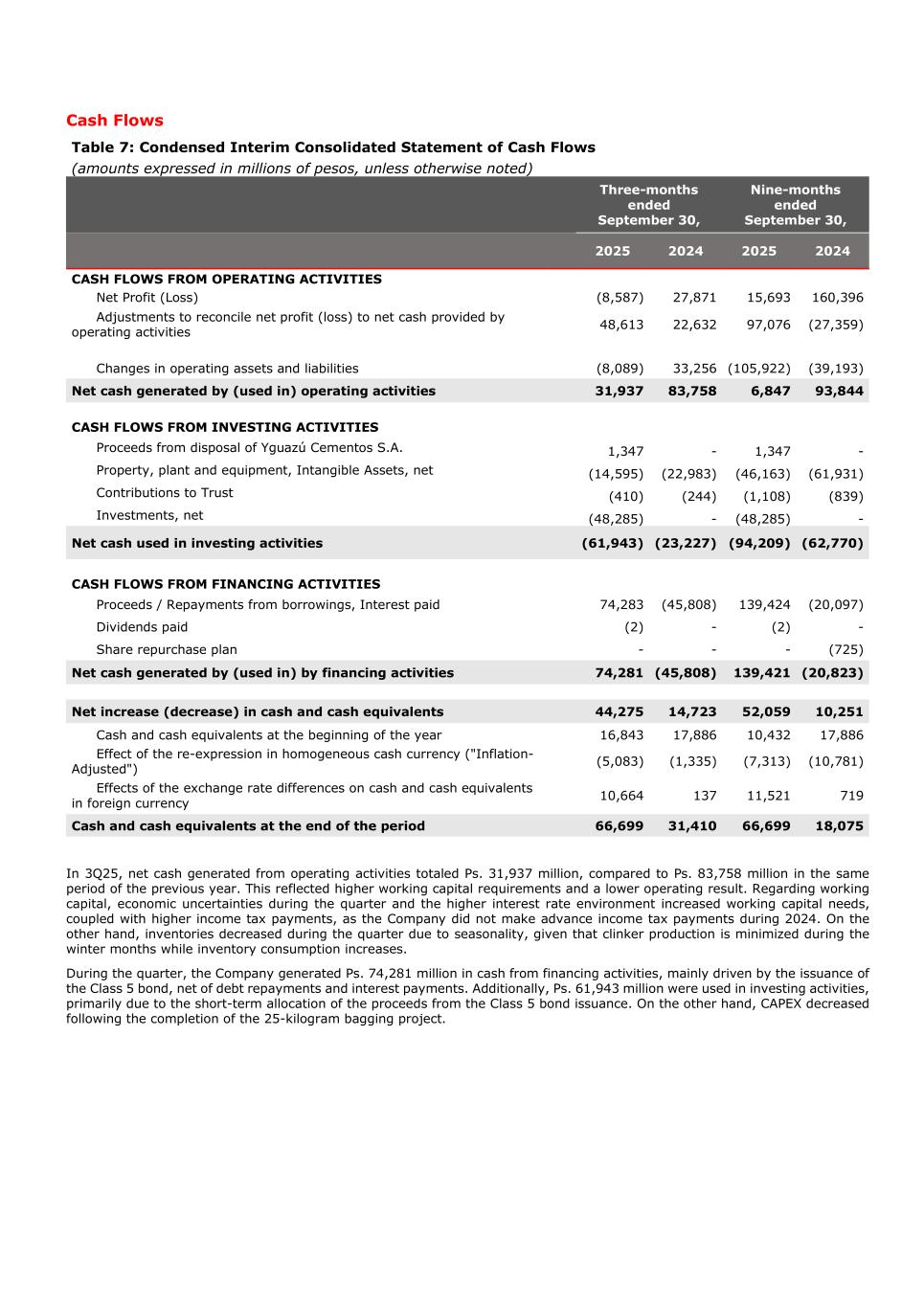 Cash Flows Table 7: Condensed Interim Consolidated Statement of Cash Flows (amounts expressed in millions of pesos, unless otherwise noted) Three-months ended September 30, Nine-months ended September 30, 2025 2024 2025 2024 CASH FLOWS FROM OPERATING ACTIVITIES Net Profit (Loss) (8,587) 27,871 15,693 160,396 Adjustments to reconcile net profit (loss) to net cash provided by operating activities 48,613 22,632 97,076 (27,359) Changes in operating assets and liabilities (8,089) 33,256 (105,922) (39,193) Net cash generated by (used in) operating activities 31,937 83,758 6,847 93,844 CASH FLOWS FROM INVESTING ACTIVITIES Proceeds from disposal of Yguazú Cementos S.A. 1,347 - 1,347 - Property, plant and equipment, Intangible Assets, net (14,595) (22,983) (46,163) (61,931) Contributions to Trust (410) (244) (1,108) (839) Investments, net (48,285) - (48,285) - Net cash used in investing activities (61,943) (23,227) (94,209) (62,770) CASH FLOWS FROM FINANCING ACTIVITIES Proceeds / Repayments from borrowings, Interest paid 74,283 (45,808) 139,424 (20,097) Dividends paid (2) - (2) - Share repurchase plan - - - (725) Net cash generated by (used in) by financing activities 74,281 (45,808) 139,421 (20,823) Net increase (decrease) in cash and cash equivalents 44,275 14,723 52,059 10,251 Cash and cash equivalents at the beginning of the year 16,843 17,886 10,432 17,886 Effect of the re-expression in homogeneous cash currency ("Inflation- Adjusted") (5,083) (1,335) (7,313) (10,781) Effects of the exchange rate differences on cash and cash equivalents in foreign currency 10,664 137 11,521 719 Cash and cash equivalents at the end of the period 66,699 31,410 66,699 18,075 In 3Q25, net cash generated from operating activities totaled Ps. 31,937 million, compared to Ps. 83,758 million in the same period of the previous year. This reflected higher working capital requirements and a lower operating result. Regarding working capital, economic uncertainties during the quarter and the higher interest rate environment increased working capital needs, coupled with higher income tax payments, as the Company did not make advance income tax payments during 2024. On the other hand, inventories decreased during the quarter due to seasonality, given that clinker production is minimized during the winter months while inventory consumption increases. During the quarter, the Company generated Ps. 74,281 million in cash from financing activities, mainly driven by the issuance of the Class 5 bond, net of debt repayments and interest payments. Additionally, Ps. 61,943 million were used in investing activities, primarily due to the short-term allocation of the proceeds from the Class 5 bond issuance. On the other hand, CAPEX decreased following the completion of the 25-kilogram bagging project.