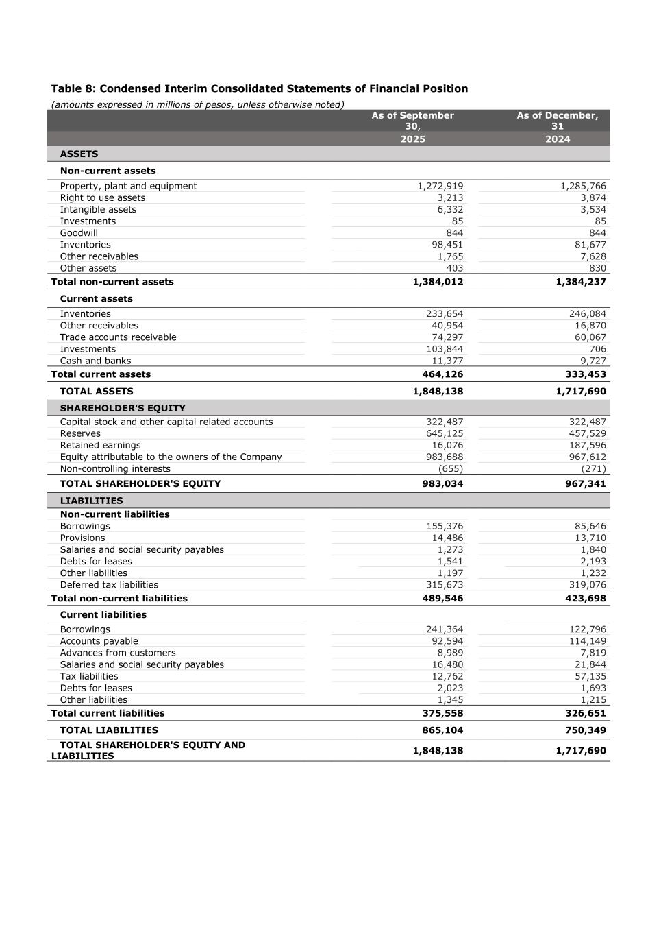 Table 8: Condensed Interim Consolidated Statements of Financial Position (amounts expressed in millions of pesos, unless otherwise noted) As of September 30, As of December, 31 2025 2024 ASSETS Non-current assets Property, plant and equipment 1,272,919 1,285,766 Right to use assets 3,213 3,874 Intangible assets 6,332 3,534 Investments 85 85 Goodwill 844 844 Inventories 98,451 81,677 Other receivables 1,765 7,628 Other assets 403 830 Total non-current assets 1,384,012 1,384,237 Current assets Inventories 233,654 246,084 Other receivables 40,954 16,870 Trade accounts receivable 74,297 60,067 Investments 103,844 706 Cash and banks 11,377 9,727 Total current assets 464,126 333,453 TOTAL ASSETS 1,848,138 1,717,690 SHAREHOLDER'S EQUITY Capital stock and other capital related accounts 322,487 322,487 Reserves 645,125 457,529 Retained earnings 16,076 187,596 Equity attributable to the owners of the Company 983,688 967,612 Non-controlling interests (655) (271) TOTAL SHAREHOLDER'S EQUITY 983,034 967,341 LIABILITIES Non-current liabilities Borrowings 155,376 85,646 Provisions 14,486 13,710 Salaries and social security payables 1,273 1,840 Debts for leases 1,541 2,193 Other liabilities 1,197 1,232 Deferred tax liabilities 315,673 319,076 Total non-current liabilities 489,546 423,698 Current liabilities Borrowings 241,364 122,796 Accounts payable 92,594 114,149 Advances from customers 8,989 7,819 Salaries and social security payables 16,480 21,844 Tax liabilities 12,762 57,135 Debts for leases 2,023 1,693 Other liabilities 1,345 1,215 Total current liabilities 375,558 326,651 TOTAL LIABILITIES 865,104 750,349 TOTAL SHAREHOLDER'S EQUITY AND LIABILITIES 1,848,138 1,717,690