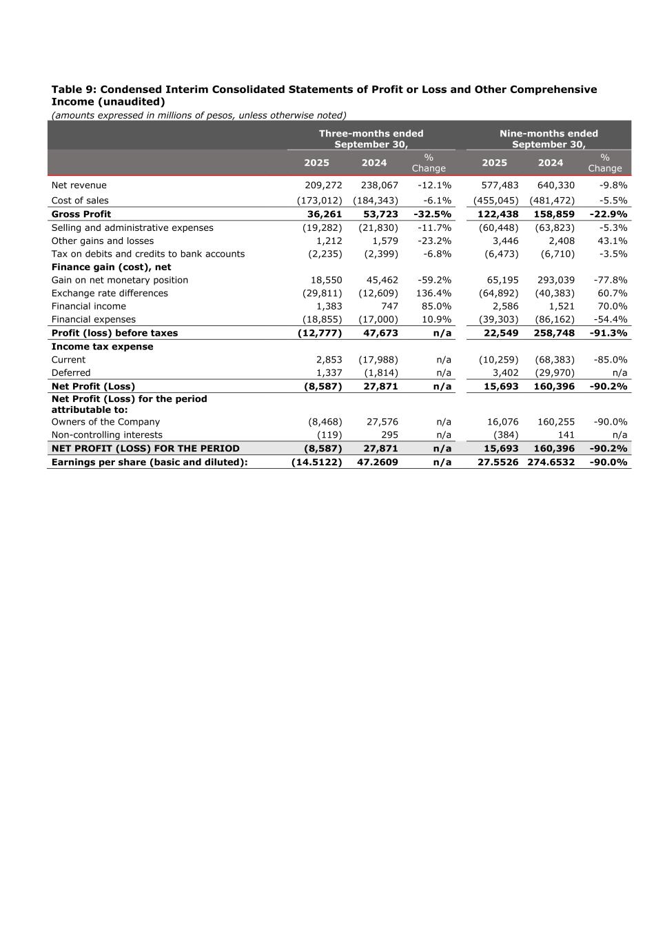 Table 9: Condensed Interim Consolidated Statements of Profit or Loss and Other Comprehensive Income (unaudited) (amounts expressed in millions of pesos, unless otherwise noted) Three-months ended September 30, Nine-months ended September 30, 2025 2024 % Change 2025 2024 % Change Net revenue 209,272 238,067 -12.1% 577,483 640,330 -9.8% Cost of sales (173,012) (184,343) -6.1% (455,045) (481,472) -5.5% Gross Profit 36,261 53,723 -32.5% 122,438 158,859 -22.9% Selling and administrative expenses (19,282) (21,830) -11.7% (60,448) (63,823) -5.3% Other gains and losses 1,212 1,579 -23.2% 3,446 2,408 43.1% Tax on debits and credits to bank accounts (2,235) (2,399) -6.8% (6,473) (6,710) -3.5% Finance gain (cost), net Gain on net monetary position 18,550 45,462 -59.2% 65,195 293,039 -77.8% Exchange rate differences (29,811) (12,609) 136.4% (64,892) (40,383) 60.7% Financial income 1,383 747 85.0% 2,586 1,521 70.0% Financial expenses (18,855) (17,000) 10.9% (39,303) (86,162) -54.4% Profit (loss) before taxes (12,777) 47,673 n/a 22,549 258,748 -91.3% Income tax expense Current 2,853 (17,988) n/a (10,259) (68,383) -85.0% Deferred 1,337 (1,814) n/a 3,402 (29,970) n/a Net Profit (Loss) (8,587) 27,871 n/a 15,693 160,396 -90.2% Net Profit (Loss) for the period attributable to: Owners of the Company (8,468) 27,576 n/a 16,076 160,255 -90.0% Non-controlling interests (119) 295 n/a (384) 141 n/a NET PROFIT (LOSS) FOR THE PERIOD (8,587) 27,871 n/a 15,693 160,396 -90.2% Earnings per share (basic and diluted): (14.5122) 47.2609 n/a 27.5526 274.6532 -90.0%