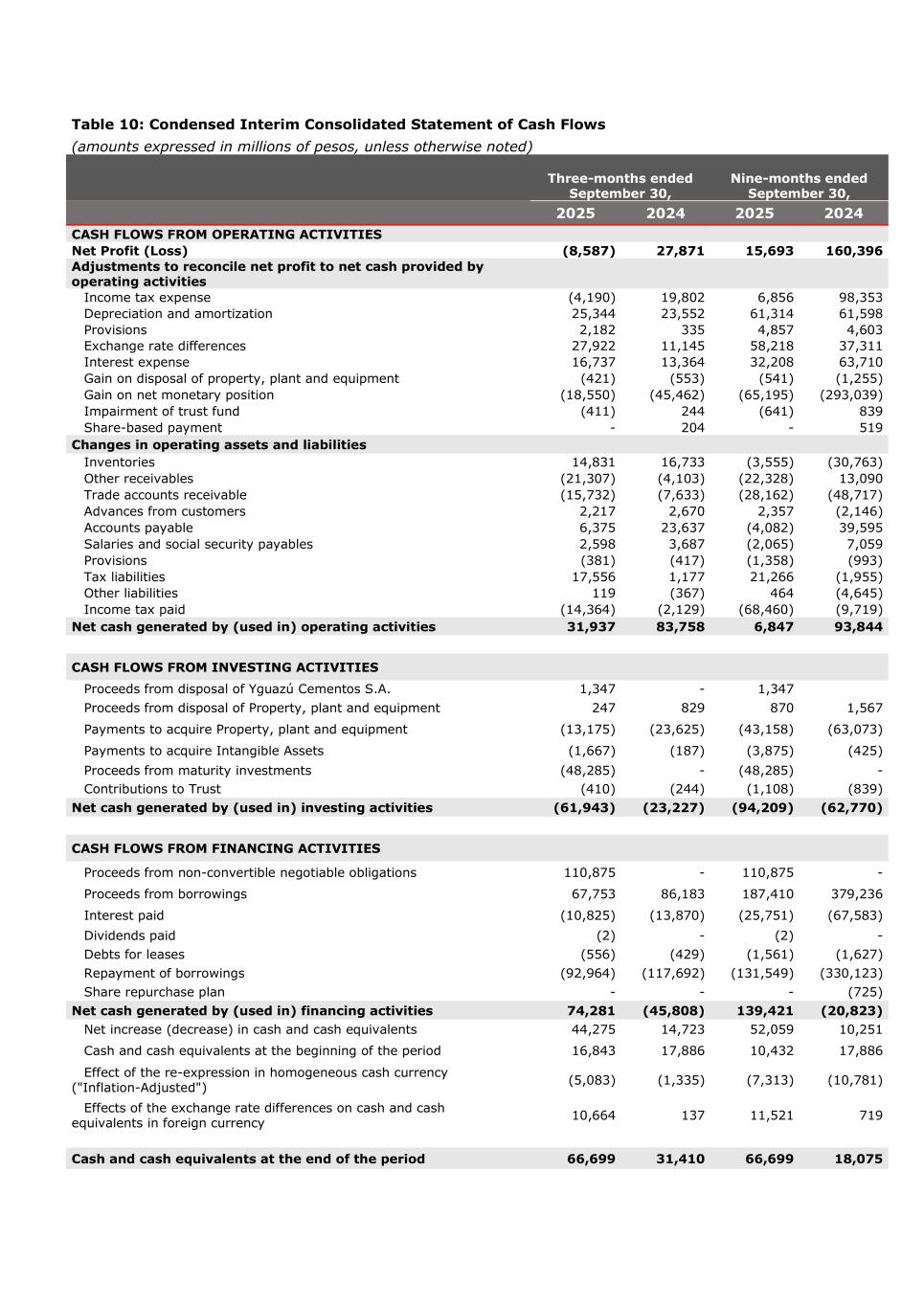 Table 10: Condensed Interim Consolidated Statement of Cash Flows (amounts expressed in millions of pesos, unless otherwise noted) Three-months ended September 30, Nine-months ended September 30, 2025 2024 2025 2024 CASH FLOWS FROM OPERATING ACTIVITIES Net Profit (Loss) (8,587) 27,871 15,693 160,396 Adjustments to reconcile net profit to net cash provided by operating activities Income tax expense (4,190) 19,802 6,856 98,353 Depreciation and amortization 25,344 23,552 61,314 61,598 Provisions 2,182 335 4,857 4,603 Exchange rate differences 27,922 11,145 58,218 37,311 Interest expense 16,737 13,364 32,208 63,710 Gain on disposal of property, plant and equipment (421) (553) (541) (1,255) Gain on net monetary position (18,550) (45,462) (65,195) (293,039) Impairment of trust fund (411) 244 (641) 839 Share-based payment - 204 - 519 Changes in operating assets and liabilities Inventories 14,831 16,733 (3,555) (30,763) Other receivables (21,307) (4,103) (22,328) 13,090 Trade accounts receivable (15,732) (7,633) (28,162) (48,717) Advances from customers 2,217 2,670 2,357 (2,146) Accounts payable 6,375 23,637 (4,082) 39,595 Salaries and social security payables 2,598 3,687 (2,065) 7,059 Provisions (381) (417) (1,358) (993) Tax liabilities 17,556 1,177 21,266 (1,955) Other liabilities 119 (367) 464 (4,645) Income tax paid (14,364) (2,129) (68,460) (9,719) Net cash generated by (used in) operating activities 31,937 83,758 6,847 93,844 CASH FLOWS FROM INVESTING ACTIVITIES Proceeds from disposal of Yguazú Cementos S.A. 1,347 - 1,347 Proceeds from disposal of Property, plant and equipment 247 829 870 1,567 Payments to acquire Property, plant and equipment (13,175) (23,625) (43,158) (63,073) Payments to acquire Intangible Assets (1,667) (187) (3,875) (425) Proceeds from maturity investments (48,285) - (48,285) - Contributions to Trust (410) (244) (1,108) (839) Net cash generated by (used in) investing activities (61,943) (23,227) (94,209) (62,770) CASH FLOWS FROM FINANCING ACTIVITIES Proceeds from non-convertible negotiable obligations 110,875 - 110,875 - Proceeds from borrowings 67,753 86,183 187,410 379,236 Interest paid (10,825) (13,870) (25,751) (67,583) Dividends paid (2) - (2) - Debts for leases (556) (429) (1,561) (1,627) Repayment of borrowings (92,964) (117,692) (131,549) (330,123) Share repurchase plan - - - (725) Net cash generated by (used in) financing activities 74,281 (45,808) 139,421 (20,823) Net increase (decrease) in cash and cash equivalents 44,275 14,723 52,059 10,251 Cash and cash equivalents at the beginning of the period 16,843 17,886 10,432 17,886 Effect of the re-expression in homogeneous cash currency ("Inflation-Adjusted") (5,083) (1,335) (7,313) (10,781) Effects of the exchange rate differences on cash and cash equivalents in foreign currency 10,664 137 11,521 719 Cash and cash equivalents at the end of the period 66,699 31,410 66,699 18,075
