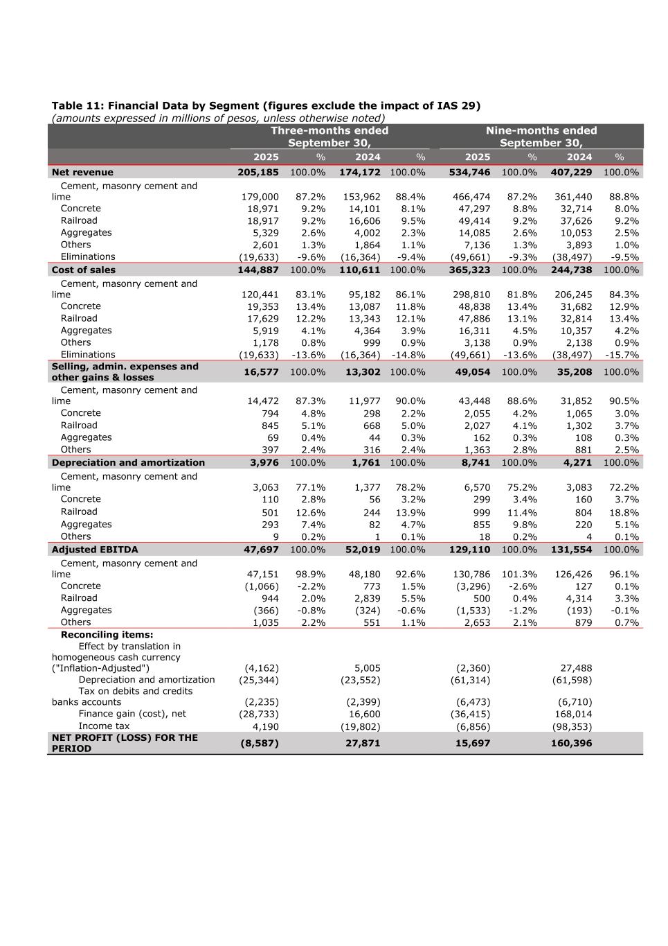 Table 11: Financial Data by Segment (figures exclude the impact of IAS 29) (amounts expressed in millions of pesos, unless otherwise noted) Three-months ended September 30, Nine-months ended September 30, 2025 % 2024 % 2025 % 2024 % Net revenue 205,185 100.0% 174,172 100.0% 534,746 100.0% 407,229 100.0% Cement, masonry cement and lime 179,000 87.2% 153,962 88.4% 466,474 87.2% 361,440 88.8% Concrete 18,971 9.2% 14,101 8.1% 47,297 8.8% 32,714 8.0% Railroad 18,917 9.2% 16,606 9.5% 49,414 9.2% 37,626 9.2% Aggregates 5,329 2.6% 4,002 2.3% 14,085 2.6% 10,053 2.5% Others 2,601 1.3% 1,864 1.1% 7,136 1.3% 3,893 1.0% Eliminations (19,633) -9.6% (16,364) -9.4% (49,661) -9.3% (38,497) -9.5% Cost of sales 144,887 100.0% 110,611 100.0% 365,323 100.0% 244,738 100.0% Cement, masonry cement and lime 120,441 83.1% 95,182 86.1% 298,810 81.8% 206,245 84.3% Concrete 19,353 13.4% 13,087 11.8% 48,838 13.4% 31,682 12.9% Railroad 17,629 12.2% 13,343 12.1% 47,886 13.1% 32,814 13.4% Aggregates 5,919 4.1% 4,364 3.9% 16,311 4.5% 10,357 4.2% Others 1,178 0.8% 999 0.9% 3,138 0.9% 2,138 0.9% Eliminations (19,633) -13.6% (16,364) -14.8% (49,661) -13.6% (38,497) -15.7% Selling, admin. expenses and other gains & losses 16,577 100.0% 13,302 100.0% 49,054 100.0% 35,208 100.0% Cement, masonry cement and lime 14,472 87.3% 11,977 90.0% 43,448 88.6% 31,852 90.5% Concrete 794 4.8% 298 2.2% 2,055 4.2% 1,065 3.0% Railroad 845 5.1% 668 5.0% 2,027 4.1% 1,302 3.7% Aggregates 69 0.4% 44 0.3% 162 0.3% 108 0.3% Others 397 2.4% 316 2.4% 1,363 2.8% 881 2.5% Depreciation and amortization 3,976 100.0% 1,761 100.0% 8,741 100.0% 4,271 100.0% Cement, masonry cement and lime 3,063 77.1% 1,377 78.2% 6,570 75.2% 3,083 72.2% Concrete 110 2.8% 56 3.2% 299 3.4% 160 3.7% Railroad 501 12.6% 244 13.9% 999 11.4% 804 18.8% Aggregates 293 7.4% 82 4.7% 855 9.8% 220 5.1% Others 9 0.2% 1 0.1% 18 0.2% 4 0.1% Adjusted EBITDA 47,697 100.0% 52,019 100.0% 129,110 100.0% 131,554 100.0% Cement, masonry cement and lime 47,151 98.9% 48,180 92.6% 130,786 101.3% 126,426 96.1% Concrete (1,066) -2.2% 773 1.5% (3,296) -2.6% 127 0.1% Railroad 944 2.0% 2,839 5.5% 500 0.4% 4,314 3.3% Aggregates (366) -0.8% (324) -0.6% (1,533) -1.2% (193) -0.1% Others 1,035 2.2% 551 1.1% 2,653 2.1% 879 0.7% Reconciling items: Effect by translation in homogeneous cash currency ("Inflation-Adjusted") (4,162) 5,005 (2,360) 27,488 Depreciation and amortization (25,344) (23,552) (61,314) (61,598) Tax on debits and credits banks accounts (2,235) (2,399) (6,473) (6,710) Finance gain (cost), net (28,733) 16,600 (36,415) 168,014 Income tax 4,190 (19,802) (6,856) (98,353) NET PROFIT (LOSS) FOR THE PERIOD (8,587) 27,871 15,697 160,396