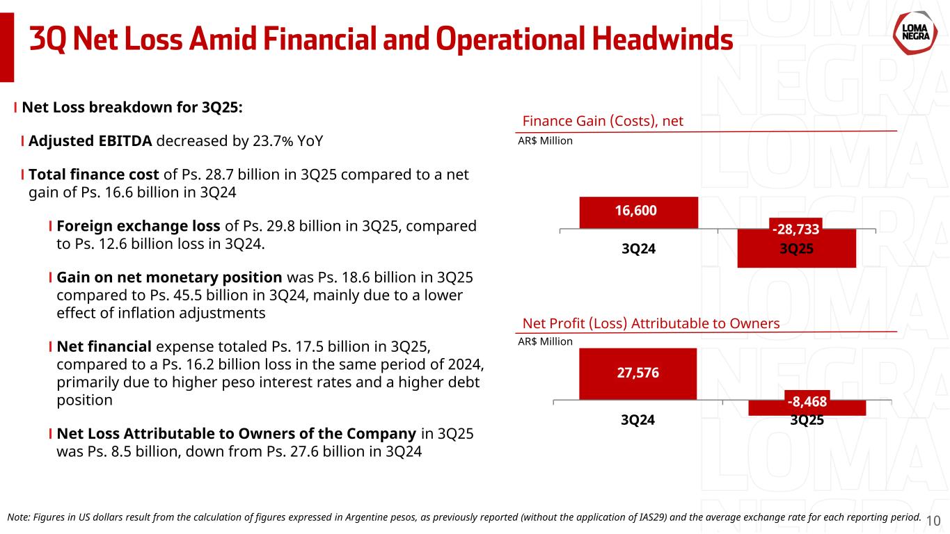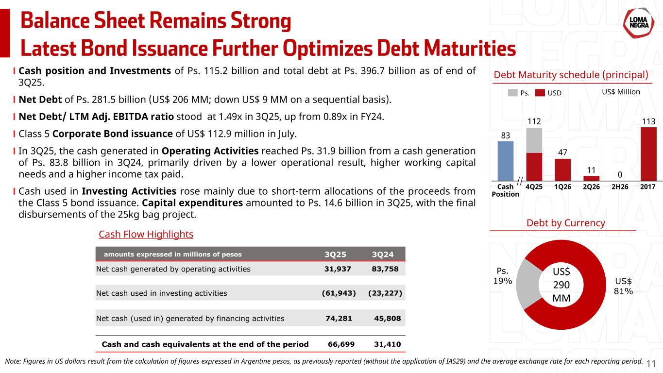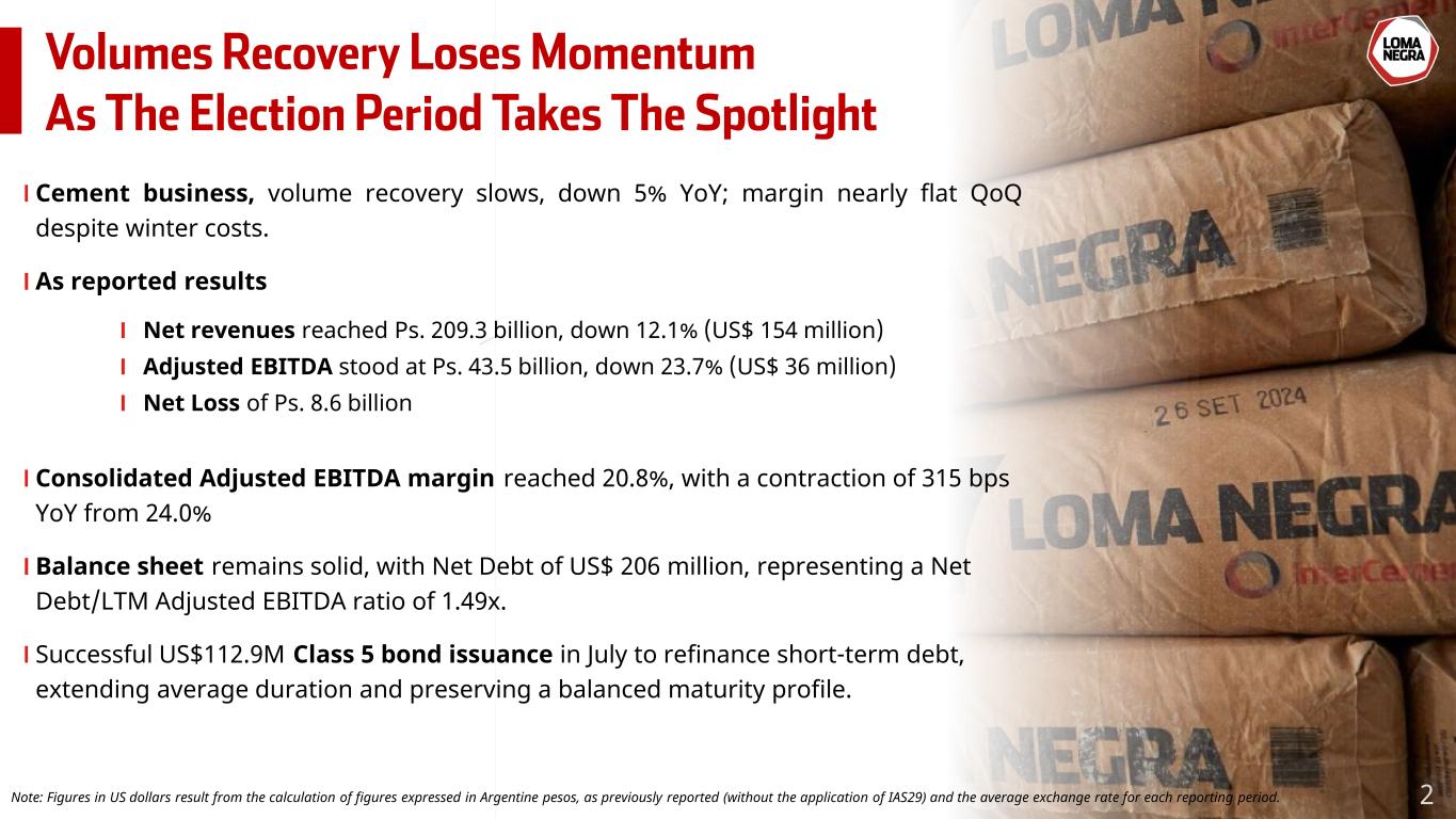 Volumes Recovery Loses Momentum As The Election Period Takes The Spotlight Cement business, volume recovery slows, down 5% YoY; margin nearly flat QoQ despite winter costs. As reported results Net revenues reached Ps. 209.3 billion, down 12.1% (US$ 154 million) Adjusted EBITDA stood at Ps. 43.5 billion, down 23.7% (US$ 36 million) Net Loss of Ps. 8.6 billion Consolidated Adjusted EBITDA margin reached 20.8%, with a contraction of 315 bps YoY from 24.0% Balance sheet remains solid, with Net Debt of US$ 206 million, representing a Net Debt/LTM Adjusted EBITDA ratio of 1.49x. Successful US$112.9M Class 5 bond issuance in July to refinance short-term debt, extending average duration and preserving a balanced maturity profile. Note: Figures in US dollars result from the calculation of figures expressed in Argentine pesos, as previously reported (without the application of IAS29) and the average exchange rate for each reporting period. 2