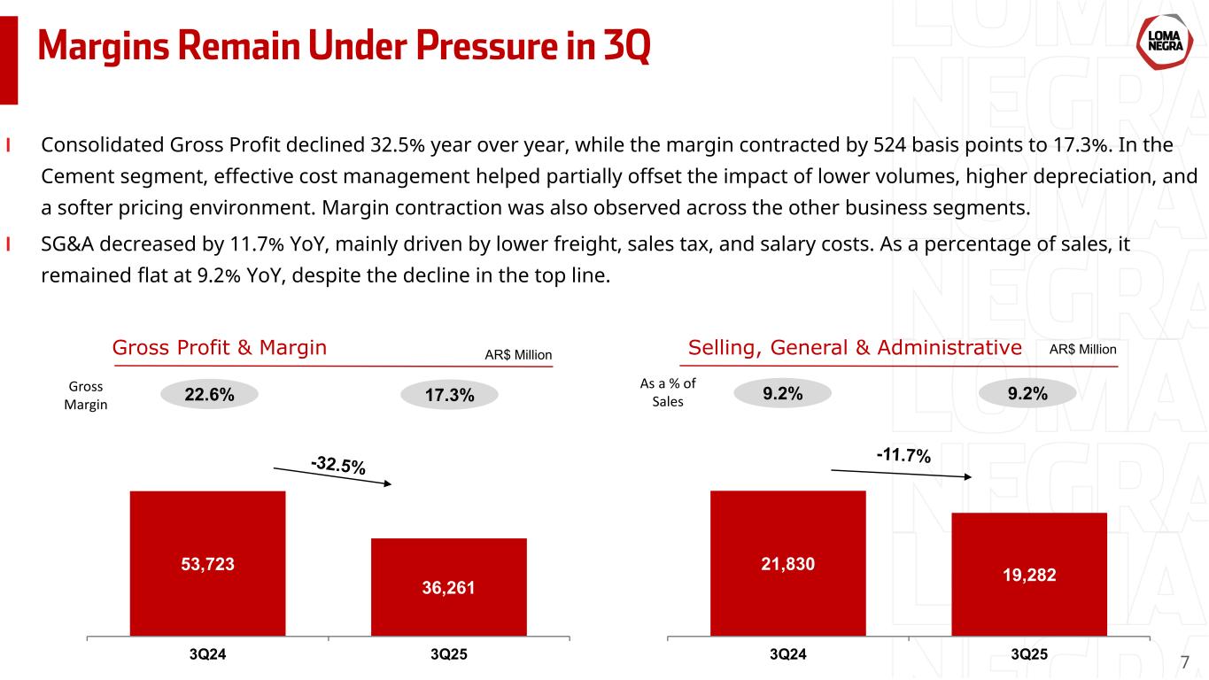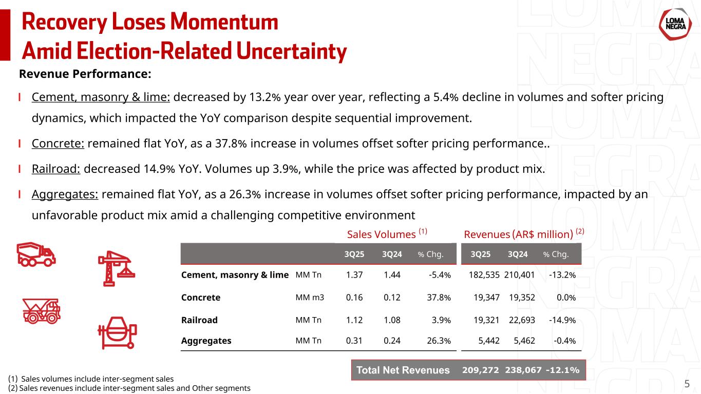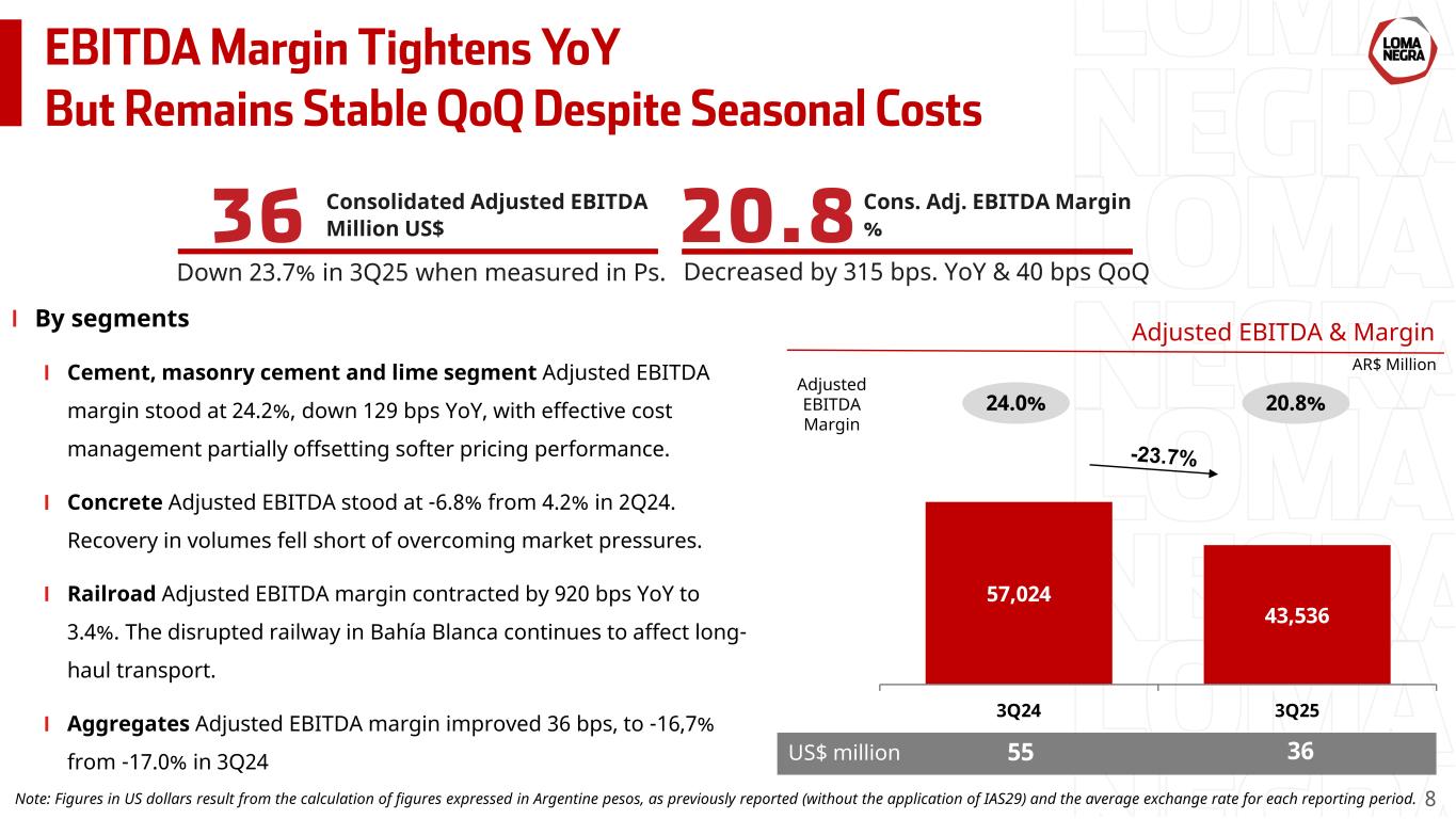 Volumes Recovery Loses Momentum As The Election Period Takes The Spotlight Cement business, volume recovery slows, down 5% YoY; margin nearly flat QoQ despite winter costs. As reported results Net revenues reached Ps. 209.3 billion, down 12.1% (US$ 154 million) Adjusted EBITDA stood at Ps. 43.5 billion, down 23.7% (US$ 36 million) Net Loss of Ps. 8.6 billion Consolidated Adjusted EBITDA margin reached 20.8%, with a contraction of 315 bps YoY from 24.0% Balance sheet remains solid, with Net Debt of US$ 206 million, representing a Net Debt/LTM Adjusted EBITDA ratio of 1.49x. Successful US$112.9M Class 5 bond issuance in July to refinance short-term debt, extending average duration and preserving a balanced maturity profile. Note: Figures in US dollars result from the calculation of figures expressed in Argentine pesos, as previously reported (without the application of IAS29) and the average exchange rate for each reporting period. 2