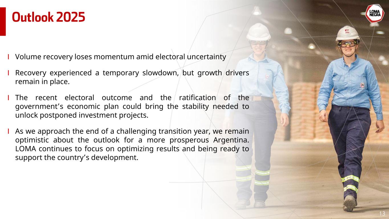 Outlook 2025 Volume recovery loses momentum amid electoral uncertainty Recovery experienced a temporary slowdown, but growth drivers remain in place. The recent electoral outcome and the ratification of the government’s economic plan could bring the stability needed to unlock postponed investment projects. As we approach the end of a challenging transition year, we remain optimistic about the outlook for a more prosperous Argentina. LOMA continues to focus on optimizing results and being ready to support the country’s development. 13