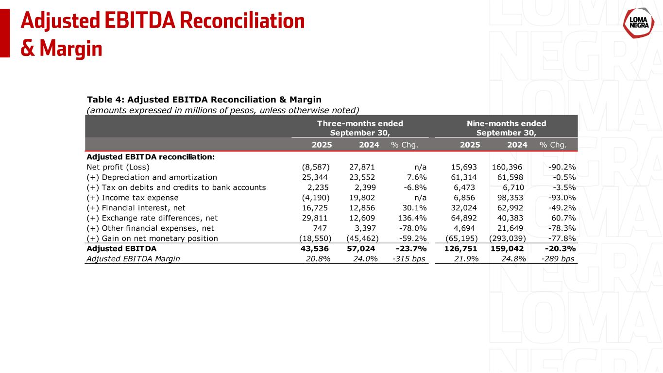 Adjusted EBITDA Reconciliation & Margin Table 4: Adjusted EBITDA Reconciliation & Margin (amounts expressed in millions of pesos, unless otherwise noted) 2025 2024 % Chg. 2025 2024 % Chg. Adjusted EBITDA reconciliation: Net profit (Loss) (8,587) 27,871 n/a 15,693 160,396 -90.2% (+) Depreciation and amortization 25,344 23,552 7.6% 61,314 61,598 -0.5% (+) Tax on debits and credits to bank accounts 2,235 2,399 -6.8% 6,473 6,710 -3.5% (+) Income tax expense (4,190) 19,802 n/a 6,856 98,353 -93.0% (+) Financial interest, net 16,725 12,856 30.1% 32,024 62,992 -49.2% (+) Exchange rate differences, net 29,811 12,609 136.4% 64,892 40,383 60.7% (+) Other financial expenses, net 747 3,397 -78.0% 4,694 21,649 -78.3% (+) Gain on net monetary position (18,550) (45,462) -59.2% (65,195) (293,039) -77.8% Adjusted EBITDA 43,536 57,024 -23.7% 126,751 159,042 -20.3% Adjusted EBITDA Margin 20.8% 24.0% -315 bps 21.9% 24.8% -289 bps Three-months ended September 30, Nine-months ended September 30,