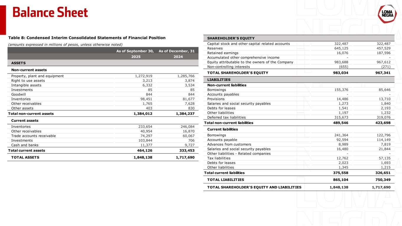 Balance Sheet As of September 30, As of December, 31 2025 2024 ASSETS Non-current assets Property, plant and equipment 1,272,919 1,285,766 Right to use assets 3,213 3,874 Intangible assets 6,332 3,534 Investments 85 85 Goodwill 844 844 Inventories 98,451 81,677 Other receivables 1,765 7,628 Other assets 403 830 Total non-current assets 1,384,012 1,384,237 Current assets Inventories 233,654 246,084 Other receivables 40,954 16,870 Trade accounts receivable 74,297 60,067 Investments 103,844 706 Cash and banks 11,377 9,727 Total current assets 464,126 333,453 TOTAL ASSETS 1,848,138 1,717,690 Table 8: Condensed Interim Consolidated Statements of Financial Position (amounts expressed in millions of pesos, unless otherwise noted) SHAREHOLDER'S EQUITY Capital stock and other capital related accounts 322,487 322,487 Reserves 645,125 457,529 Retained earnings 16,076 187,596 Accumulated other comprehensive income - - Equity attributable to the owners of the Company 983,688 967,612 Non-controlling interests (655) (271) TOTAL SHAREHOLDER'S EQUITY 983,034 967,341 LIABILITIES Non-current liabilities Borrowings 155,376 85,646 Accounts payables - - Provisions 14,486 13,710 Salaries and social security payables 1,273 1,840 Debts for leases 1,541 2,193 Other liabilities 1,197 1,232 Deferred tax liabilities 315,673 319,076 Total non-current liabilities 489,546 423,698 Current liabilities Borrowings 241,364 122,796 Accounts payable 92,594 114,149 Advances from customers 8,989 7,819 Salaries and social security payables 16,480 21,844 Other liabilities - Related companies - - Tax liabilities 12,762 57,135 Debts for leases 2,023 1,693 Other liabilities 1,345 1,215 Total current liabilities 375,558 326,651 TOTAL LIABILITIES 865,104 750,349 TOTAL SHAREHOLDER'S EQUITY AND LIABILITIES 1,848,138 1,717,690