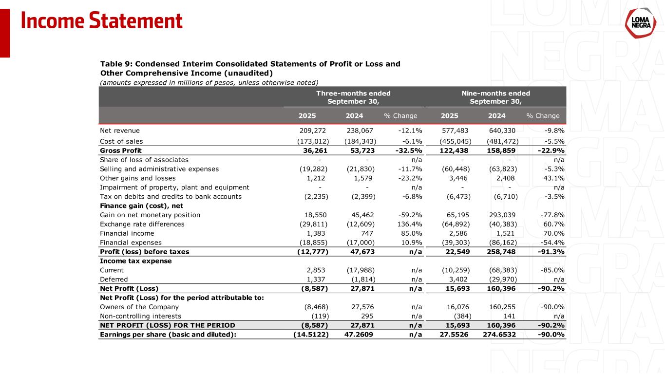 Income Statement (amounts expressed in millions of pesos, unless otherwise noted) 2025 2024 % Change 2025 2024 % Change Net revenue 209,272 238,067 -12.1% 577,483 640,330 -9.8% Cost of sales (173,012) (184,343) -6.1% (455,045) (481,472) -5.5% Gross Profit 36,261 53,723 -32.5% 122,438 158,859 -22.9% Share of loss of associates - - n/a - - n/a Selling and administrative expenses (19,282) (21,830) -11.7% (60,448) (63,823) -5.3% Other gains and losses 1,212 1,579 -23.2% 3,446 2,408 43.1% Impairment of property, plant and equipment - - n/a - - n/a Tax on debits and credits to bank accounts (2,235) (2,399) -6.8% (6,473) (6,710) -3.5% Finance gain (cost), net Gain on net monetary position 18,550 45,462 -59.2% 65,195 293,039 -77.8% Exchange rate differences (29,811) (12,609) 136.4% (64,892) (40,383) 60.7% Financial income 1,383 747 85.0% 2,586 1,521 70.0% Financial expenses (18,855) (17,000) 10.9% (39,303) (86,162) -54.4% Profit (loss) before taxes (12,777) 47,673 n/a 22,549 258,748 -91.3% Income tax expense Current 2,853 (17,988) n/a (10,259) (68,383) -85.0% Deferred 1,337 (1,814) n/a 3,402 (29,970) n/a Net Profit (Loss) (8,587) 27,871 n/a 15,693 160,396 -90.2% Net Profit (Loss) for the period attributable to: Owners of the Company (8,468) 27,576 n/a 16,076 160,255 -90.0% Non-controlling interests (119) 295 n/a (384) 141 n/a NET PROFIT (LOSS) FOR THE PERIOD (8,587) 27,871 n/a 15,693 160,396 -90.2% Earnings per share (basic and diluted): (14.5122) 47.2609 n/a 27.5526 274.6532 -90.0% Table 9: Condensed Interim Consolidated Statements of Profit or Loss and Other Comprehensive Income (unaudited) Three-months ended September 30, Nine-months ended September 30,