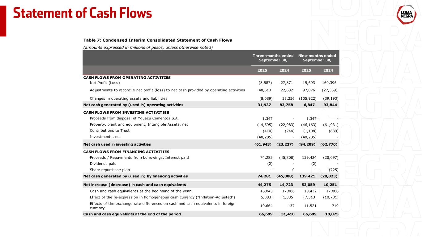 Statement of Cash Flows Table 7: Condensed Interim Consolidated Statement of Cash Flows (amounts expressed in millions of pesos, unless otherwise noted) 2025 2024 2025 2024 CASH FLOWS FROM OPERATING ACTIVITIES    Net Profit (Loss) (8,587) 27,871 15,693 160,396 Adjustments to reconcile net profit (loss) to net cash provided by operating activities    48,613 22,632 97,076 (27,359) Changes in operating assets and liabilities    (8,089) 33,256 (105,922) (39,193) Net cash generated by (used in) operating activities    31,937 83,758 6,847 93,844    CASH FLOWS FROM INVESTING ACTIVITIES    Proceeds from disposal of Yguazú Cementos S.A.    1,347 - 1,347 - Property, plant and equipment, Intangible Assets, net    (14,595) (22,983) (46,163) (61,931) Contributions to Trust    (410) (244) (1,108) (839) Investments, net (48,285) - (48,285) - Net cash used in investing activities    (61,943) (23,227) (94,209) (62,770)    CASH FLOWS FROM FINANCING ACTIVITIES    Proceeds / Repayments from borrowings, Interest paid    74,283 (45,808) 139,424 (20,097) Dividends paid (2) - (2) - Share repurchase plan - 0 - (725) Net cash generated by (used in) by financing activities    74,281 (45,808) 139,421 (20,823)    Net increase (decrease) in cash and cash equivalents    44,275 14,723 52,059 10,251 Cash and cash equivalents at the beginning of the year    16,843 17,886 10,432 17,886 Effect of the re-expression in homogeneous cash currency ("Inflation-Adjusted") (5,083) (1,335) (7,313) (10,781) Effects of the exchange rate differences on cash and cash equivalents in foreign currency    10,664 137 11,521 719 Cash and cash equivalents at the end of the period    66,699 31,410 66,699 18,075 Nine-months ended September 30, Three-months ended September 30,