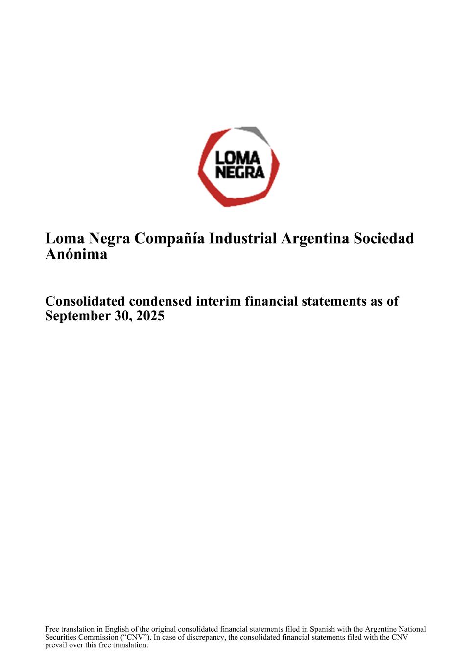 Loma Negra Compañía Industrial Argentina Sociedad Anónima Consolidated condensed interim financial statements as of September 30, 2025 Free translation in English of the original consolidated financial statements filed in Spanish with the Argentine National Securities Commission (“CNV”). In case of discrepancy, the consolidated financial statements filed with the CNV prevail over this free translation.