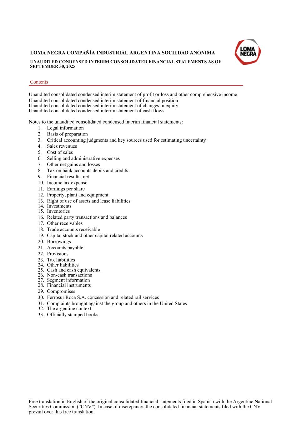 LOMA NEGRA COMPAÑÍA INDUSTRIAL ARGENTINA SOCIEDAD ANÓNIMA UNAUDITED CONDENSED INTERIM CONSOLIDATED FINANCIAL STATEMENTS AS OF SEPTEMBER 30, 2025 Contents Unaudited consolidated condensed interim statement of profit or loss and other comprehensive income Unaudited consolidated condensed interim statement of financial position Unaudited consolidated condensed interim statement of changes in equity Unaudited consolidated condensed interim statement of cash flows Notes to the unaudited consolidated condensed interim financial statements: 1. Legal information 2. Basis of preparation 3. Critical accounting judgments and key sources used for estimating uncertainty 4. Sales revenues 5. Cost of sales 6. Selling and administrative expenses 7. Other net gains and losses 8. Tax on bank accounts debits and credits 9. Financial results, net 10. Income tax expense 11. Earnings per share 12. Property, plant and equipment 13. Right of use of assets and lease liabilities 14. Investments 15. Inventories 16. Related party transactions and balances 17. Other receivables 18. Trade accounts receivable 19. Capital stock and other capital related accounts 20. Borrowings 21. Accounts payable 22. Provisions 23. Tax liabilities 24. Other liabilities 25. Cash and cash equivalents 26. Non-cash transactions 27. Segment information 28. Financial instruments 29. Compromises 30. Ferrosur Roca S.A. concession and related rail services 31. Complaints brought against the group and others in the United States 32. The argentine context 33. Officially stamped books Free translation in English of the original consolidated financial statements filed in Spanish with the Argentine National Securities Commission (“CNV”). In case of discrepancy, the consolidated financial statements filed with the CNV prevail over this free translation.