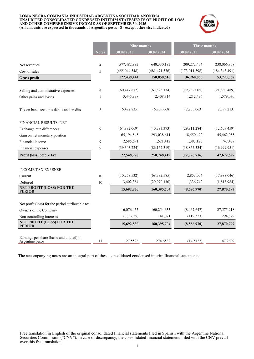 Nine months Three months Notes 30.09.2025 30.09.2024 30.09.2025 30.09.2024 Net revenues 4 577,482,992 640,330,192 209,272,454 238,066,858 Cost of sales 5 (455,044,548) (481,471,576) (173,011,598) (184,343,491) Gross profit 122,438,444 158,858,616 36,260,856 53,723,367 Selling and administrative expenses 6 (60,447,872) (63,823,174) (19,282,005) (21,830,489) Other gains and losses 7 3,445,998 2,408,314 1,212,496 1,579,030 Tax on bank accounts debits and credits 8 (6,472,835) (6,709,668) (2,235,063) (2,399,213) FINANCIAL RESULTS, NET Exchange rate differences 9 (64,892,069) (40,383,373) (29,811,284) (12,609,459) Gain on net monetary position 65,194,845 293,038,611 18,550,492 45,462,055 Financial income 9 2,585,691 1,521,412 1,383,126 747,487 Financial expenses 9 (39,303,224) (86,162,319) (18,855,334) (16,999,951) Profit (loss) before tax 22,548,978 258,748,419 (12,776,716) 47,672,827 INCOME TAX EXPENSE Current 10 (10,258,532) (68,382,585) 2,853,004 (17,988,046) Deferred 10 3,402,384 (29,970,130) 1,336,742 (1,813,984) NET PROFIT (LOSS) FOR THE PERIOD 15,692,830 160,395,704 (8,586,970) 27,870,797 Net profit (loss) for the period attributable to: Owners of the Company 16,076,455 160,254,633 (8,467,647) 27,575,918 Non-controlling interests (383,625) 141,071 (119,323) 294,879 NET PROFIT (LOSS) FOR THE PERIOD 15,692,830 160,395,704 (8,586,970) 27,870,797 Earnings per share (basic and diluted) in Argentine pesos 11 27.5526 274.6532 (14.5122) 47.2609 The accompanying notes are an integral part of these consolidated condensed interim financial statements. LOMA NEGRA COMPAÑÍA INDUSTRIAL ARGENTINA SOCIEDAD ANÓNIMA UNAUDITED CONSOLIDATED CONDENSED INTERIM STATEMENTS OF PROFIT OR LOSS AND OTHER COMPREHENSIVE INCOME AS OF SEPTEMBER 30, 2025 (All amounts are expressed in thousands of Argentine pesos - $ - except otherwise indicated) Free translation in English of the original consolidated financial statements filed in Spanish with the Argentine National Securities Commission (“CNV”). In case of discrepancy, the consolidated financial statements filed with the CNV prevail over this free translation. 1