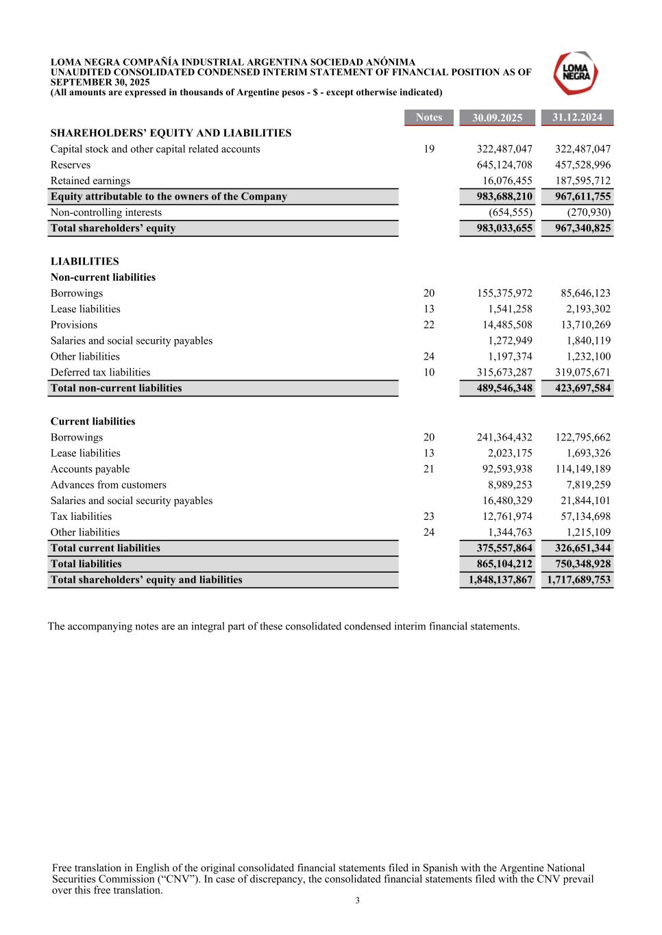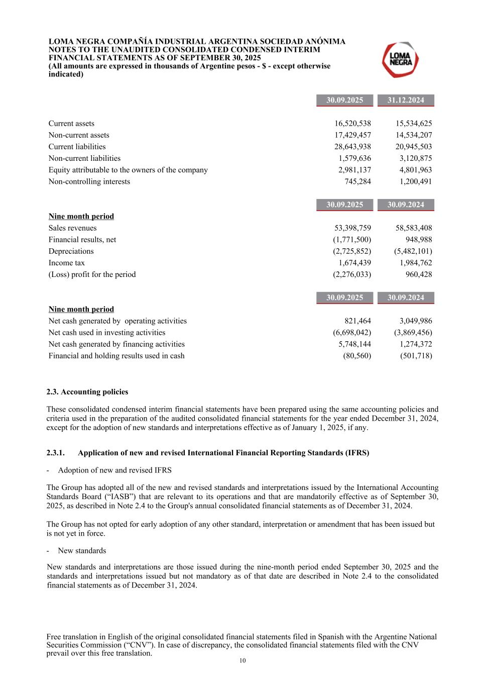 30.09.2025 31.12.2024 Current assets 16,520,538 15,534,625 Non-current assets 17,429,457 14,534,207 Current liabilities 28,643,938 20,945,503 Non-current liabilities 1,579,636 3,120,875 Equity attributable to the owners of the company 2,981,137 4,801,963 Non-controlling interests 745,284 1,200,491 30.09.2025 30.09.2024 Nine month period Sales revenues 53,398,759 58,583,408 Financial results, net (1,771,500) 948,988 Depreciations (2,725,852) (5,482,101) Income tax 1,674,439 1,984,762 (Loss) profit for the period (2,276,033) 960,428 30.09.2025 30.09.2024 Nine month period Net cash generated by operating activities 821,464 3,049,986 Net cash used in investing activities (6,698,042) (3,869,456) Net cash generated by financing activities 5,748,144 1,274,372 Financial and holding results used in cash (80,560) (501,718) 2.3. Accounting policies These consolidated condensed interim financial statements have been prepared using the same accounting policies and criteria used in the preparation of the audited consolidated financial statements for the year ended December 31, 2024, except for the adoption of new standards and interpretations effective as of January 1, 2025, if any. 2.3.1. Application of new and revised International Financial Reporting Standards (IFRS) - Adoption of new and revised IFRS The Group has adopted all of the new and revised standards and interpretations issued by the International Accounting Standards Board (“IASB”) that are relevant to its operations and that are mandatorily effective as of September 30, 2025, as described in Note 2.4 to the Group's annual consolidated financial statements as of December 31, 2024. The Group has not opted for early adoption of any other standard, interpretation or amendment that has been issued but is not yet in force. - New standards New standards and interpretations are those issued during the nine-month period ended September 30, 2025 and the standards and interpretations issued but not mandatory as of that date are described in Note 2.4 to the consolidated financial statements as of December 31, 2024. LOMA NEGRA COMPAÑÍA INDUSTRIAL ARGENTINA SOCIEDAD ANÓNIMA NOTES TO THE UNAUDITED CONSOLIDATED CONDENSED INTERIM FINANCIAL STATEMENTS AS OF SEPTEMBER 30, 2025 (All amounts are expressed in thousands of Argentine pesos - $ - except otherwise indicated) Free translation in English of the original consolidated financial statements filed in Spanish with the Argentine National Securities Commission (“CNV”). In case of discrepancy, the consolidated financial statements filed with the CNV prevail over this free translation. 10