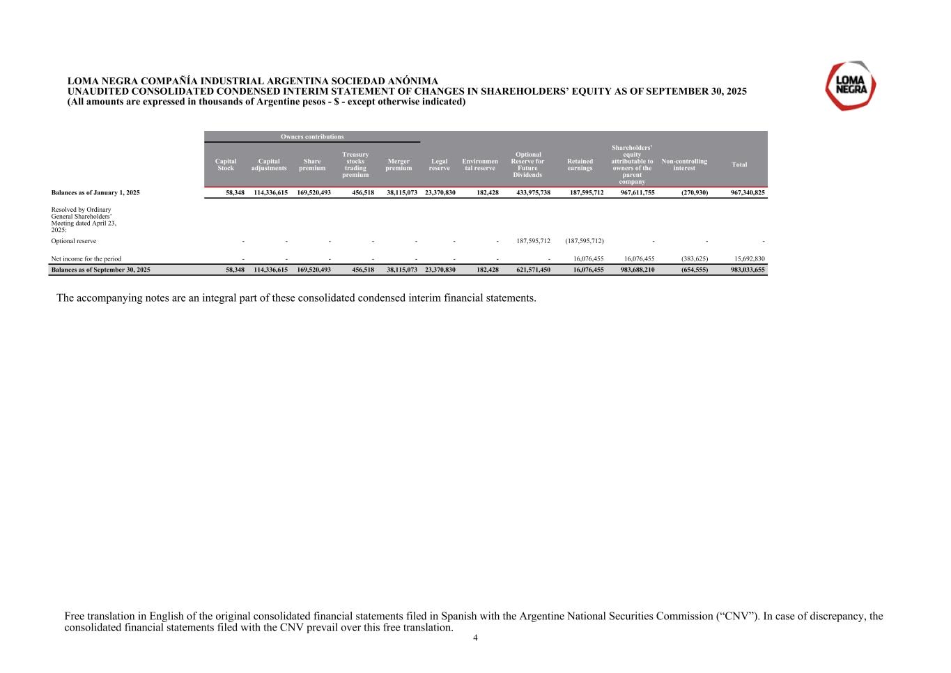 Owners contributions Capital Stock Capital adjustments Share premium Treasury stocks trading premium Merger premium Legal reserve Environmen tal reserve Optional Reserve for Future Dividends Retained earnings Shareholders’ equity attributable to owners of the parent company Non-controlling interest Total Balances as of January 1, 2025 58,348 114,336,615 169,520,493 456,518 38,115,073 23,370,830 182,428 433,975,738 187,595,712 967,611,755 (270,930) 967,340,825 Resolved by Ordinary General Shareholders’ Meeting dated April 23, 2025: Optional reserve - - - - - - - 187,595,712 (187,595,712) - - - Net income for the period - - - - - - - - 16,076,455 16,076,455 (383,625) 15,692,830 Balances as of September 30, 2025 58,348 114,336,615 169,520,493 456,518 38,115,073 23,370,830 182,428 621,571,450 16,076,455 983,688,210 (654,555) 983,033,655 The accompanying notes are an integral part of these consolidated condensed interim financial statements. LOMA NEGRA COMPAÑÍA INDUSTRIAL ARGENTINA SOCIEDAD ANÓNIMA UNAUDITED CONSOLIDATED CONDENSED INTERIM STATEMENT OF CHANGES IN SHAREHOLDERS’ EQUITY AS OF SEPTEMBER 30, 2025 (All amounts are expressed in thousands of Argentine pesos - $ - except otherwise indicated) Free translation in English of the original consolidated financial statements filed in Spanish with the Argentine National Securities Commission (“CNV”). In case of discrepancy, the consolidated financial statements filed with the CNV prevail over this free translation. 4