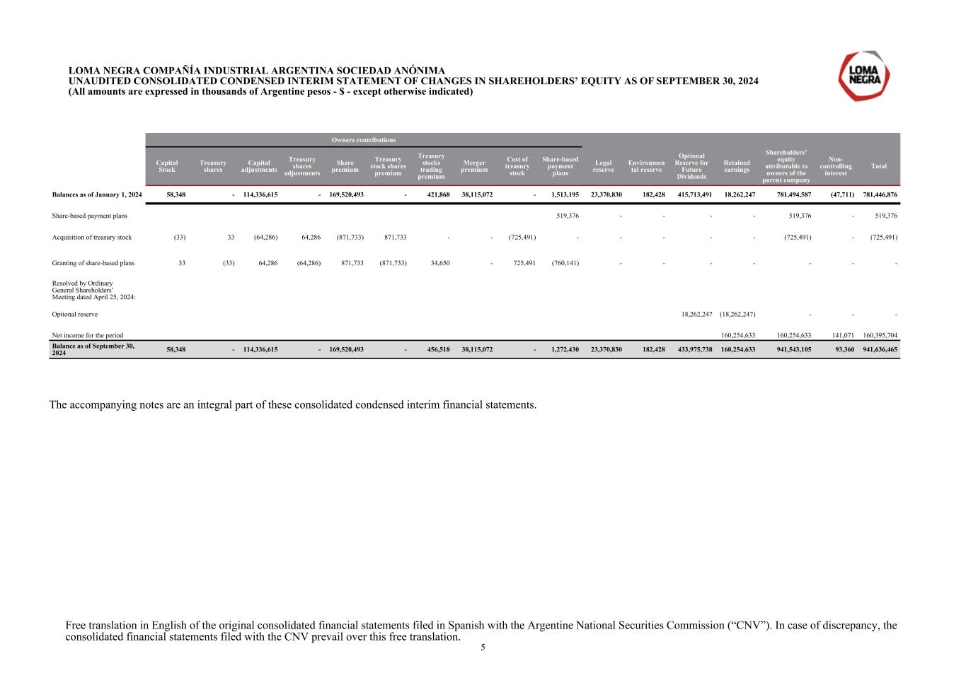 Owners contributions Capital Stock Treasury shares Capital adjustments Treasury shares adjustments Share premium Treasury stock shares premium Treasury stocks trading premium Merger premium Cost of treasury stock Share-based payment plans Legal reserve Environmen tal reserve Optional Reserve for Future Dividends Retained earnings Shareholders’ equity attributable to owners of the parent company Non- controlling interest Total Balances as of January 1, 2024 58,348 - 114,336,615 - 169,520,493 - 421,868 38,115,072 - 1,513,195 23,370,830 182,428 415,713,491 18,262,247 781,494,587 (47,711) 781,446,876 Share-based payment plans 519,376 - - - - 519,376 - 519,376 Acquisition of treasury stock (33) 33 (64,286) 64,286 (871,733) 871,733 - - (725,491) - - - - - (725,491) - (725,491) Granting of share-based plans 33 (33) 64,286 (64,286) 871,733 (871,733) 34,650 - 725,491 (760,141) - - - - - - - Resolved by Ordinary General Shareholders’ Meeting dated April 25, 2024: Optional reserve 18,262,247 (18,262,247) - - - Net income for the period 160,254,633 160,254,633 141,071 160,395,704 Balance as of September 30, 2024 58,348 - 114,336,615 - 169,520,493 - 456,518 38,115,072 - 1,272,430 23,370,830 182,428 433,975,738 160,254,633 941,543,105 93,360 941,636,465 The accompanying notes are an integral part of these consolidated condensed interim financial statements. LOMA NEGRA COMPAÑÍA INDUSTRIAL ARGENTINA SOCIEDAD ANÓNIMA UNAUDITED CONSOLIDATED CONDENSED INTERIM STATEMENT OF CHANGES IN SHAREHOLDERS’ EQUITY AS OF SEPTEMBER 30, 2024 (All amounts are expressed in thousands of Argentine pesos - $ - except otherwise indicated) Free translation in English of the original consolidated financial statements filed in Spanish with the Argentine National Securities Commission (“CNV”). In case of discrepancy, the consolidated financial statements filed with the CNV prevail over this free translation. 5