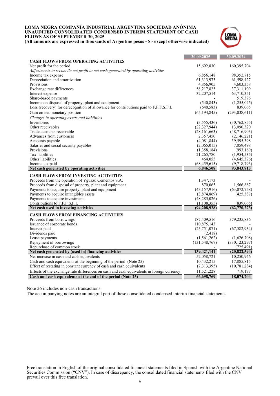 30.09.2025 30.09.2024 CASH FLOWS FROM OPERATING ACTIVITIES Net profit for the period 15,692,830 160,395,704 Adjustments to reconcile net profit to net cash generated by operating activities Income tax expense 6,856,148 98,352,715 Depreciation and amortization 61,313,973 61,598,427 Provisions 4,856,905 4,603,358 Exchange rate differences 58,217,825 37,311,109 Interest expense 32,207,514 63,710,351 Share-based payments - 519,376 Income on disposal of property, plant and equipment (540,843) (1,255,045) Loss (recovery) for derecognition of allowance for contributions paid to F.F.F.S.F.I. (640,583) 839,065 Gain on net monetary position (65,194,845) (293,038,611) Changes in operating assets and liabilities Inventories (3,555,436) (30,762,855) Other receivables (22,327,944) 13,090,320 Trade accounts receivable (28,161,663) (48,716,903) Advances from customers 2,357,450 (2,146,221) Accounts payable (4,081,844) 39,595,398 Salaries and social security payables (2,065,015) 7,059,498 Provisions (1,358,184) (993,169) Tax liabilities 21,265,780 (1,954,535) Other liabilities 464,055 (4,645,376) Income tax paid (68,459,615) (9,718,793) Net cash generated by operating activities 6,846,508 93,843,813 CASH FLOWS FROM INVESTING ACTIVITIES Proceeds from the operation of Yguazu Cementos S.A. 1,347,173 - Proceeds from disposal of property, plant and equipment 870,065 1,566,887 Payments to acquire property, plant and equipment (43,157,916) (63,072,758) Payments to acquire intangibles assets (3,874,869) (425,337) Payments to acquire investments (48,285,026) - Contributions to F.F.F.S.F.I. (1,108,355) (839,065) Net cash used in investing activities (94,208,928) (62,770,273) CASH FLOWS FROM FINANCING ACTIVITIES Proceeds from borrowings 187,409,516 379,235,836 Issuance of corporate bonds 110,875,143 - Interest paid (25,751,071) (67,582,934) Dividends paid (2,418) - Lease payments (1,561,262) (1,626,708) Repayment of borrowings (131,548,767) (330,123,297) Repurchase of common stock - (725,491) Net cash generated by (used in) financing activities 139,421,141 (20,822,594) Net increase in cash and cash equivalents 52,058,721 10,250,946 Cash and cash equivalents at the beginning of the period (Note 25) 10,432,215 17,885,815 Effect of restating in constant currency of cash and cash equivalents (7,313,395) (10,781,234) Effects of the exchange rate differences on cash and cash equivalents in foreign currency 11,521,228 719,177 Cash and cash equivalents at the end of the period (Note 25) 66,698,769 18,074,704 Note 26 includes non-cash transactions The accompanying notes are an integral part of these consolidated condensed interim financial statements. LOMA NEGRA COMPAÑÍA INDUSTRIAL ARGENTINA SOCIEDAD ANÓNIMA UNAUDITED CONSOLIDATED CONDENSED INTERIM STATEMENT OF CASH FLOWS AS OF SEPTEMBER 30, 2025 (All amounts are expressed in thousands of Argentine pesos - $ - except otherwise indicated) Free translation in English of the original consolidated financial statements filed in Spanish with the Argentine National Securities Commission (“CNV”). In case of discrepancy, the consolidated financial statements filed with the CNV prevail over this free translation. 6
