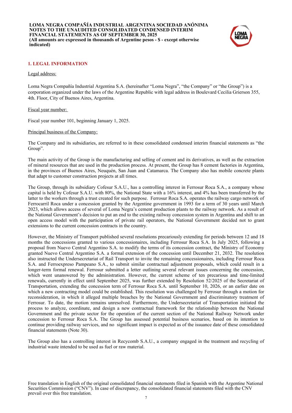 1. LEGAL INFORMATION Legal address: Loma Negra Compañía Industrial Argentina S.A. (hereinafter “Loma Negra”, “the Company” or “the Group”) is a corporation organized under the laws of the Argentine Republic with legal address in Boulevard Cecilia Grierson 355, 4th. Floor, City of Buenos Aires, Argentina. Fiscal year number: Fiscal year number 101, beginning January 1, 2025. Principal business of the Company: The Company and its subsidiaries, are referred to in these consolidated condensed interim financial statements as “the Group”. The main activity of the Group is the manufacturing and selling of cement and its derivatives, as well as the extraction of mineral resources that are used in the production process. At present, the Group has 8 cement factories in Argentina, in the provinces of Buenos Aires, Neuquén, San Juan and Catamarca. The Company also has mobile concrete plants that adapt to customer construction projects at all times. The Group, through its subsidiary Cofesur S.A.U., has a controlling interest in Ferrosur Roca S.A., a company whose capital is held by Cofesur S.A.U. with 80%, the National State with a 16% interest, and 4% has been transferred by the latter to the workers through a trust created for such purpose. Ferrosur Roca S.A. operates the railway cargo network of Ferrocarril Roca under a concession granted by the Argentine government in 1993 for a term of 30 years until March 2023, which allows access of several of Loma Negra’s cement production plants to the railway network. As a result of the National Government’s decision to put an end to the existing railway concession system in Argentina and shift to an open access model with the participation of private rail operators, the National Government decided not to grant extensions to the current concession contracts in the country. However, the Ministry of Transport published several resolutions precariously extending for periods between 12 and 18 months the concessions granted to various concessionaires, including Ferrosur Roca S.A. In July 2025, following a proposal from Nuevo Central Argentino S.A. to modify the terms of its concession contract, the Ministry of Economy granted Nuevo Central Argentino S.A. a formal extension of the concession until December 21, 2032. The resolution also instructed the Undersecretariat of Rail Transport to invite the remaining concessionaires, including Ferrosur Roca S.A. and Ferroexpreso Pampeano S.A., to submit similar contractual adjustment proposals, which could result in a longer-term formal renewal. Ferrosur submitted a letter outlining several relevant issues concerning the concession, which went unanswered by the administration. However, the current scheme of ten precarious and time-limited renewals, currently in effect until September 2025, was further extended by Resolution 52/2025 of the Secretariat of Transportation, extending the concession term of Ferrosur Roca S.A. until September 10, 2026, or an earlier date on which a new contracting model could be established. This resolution was challenged by Ferrosur through a motion for reconsideration, in which it alleged multiple breaches by the National Government and discriminatory treatment of Ferrosur. To date, the motion remains unresolved. Furthermore, the Undersecretariat of Transportation initiated the process to analyze, coordinate, and design a new contractual framework for the relationship between the National Government and the private sector for the operation of the current section of the National Railway Network under concession to Ferrosur Roca S.A. The Group has assessed potential business scenarios, based on its intention to continue providing railway services, and no significant impact is expected as of the issuance date of these consolidated financial statements (Note 30). The Group also has a controlling interest in Recycomb S.A.U., a company engaged in the treatment and recycling of industrial waste intended to be used as fuel or raw material. LOMA NEGRA COMPAÑÍA INDUSTRIAL ARGENTINA SOCIEDAD ANÓNIMA NOTES TO THE UNAUDITED CONSOLIDATED CONDENSED INTERIM FINANCIAL STATEMENTS AS OF SEPTEMBER 30, 2025 (All amounts are expressed in thousands of Argentine pesos - $ - except otherwise indicated) Free translation in English of the original consolidated financial statements filed in Spanish with the Argentine National Securities Commission (“CNV”). In case of discrepancy, the consolidated financial statements filed with the CNV prevail over this free translation. 7