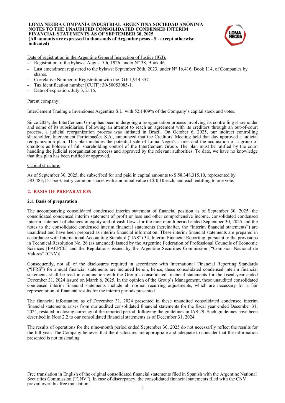 Date of registration in the Argentine General Inspection of Justice (IGJ): - Registration of the bylaws: August 5th, 1926, under N° 38, Book 46. - Last amendment registered to the bylaws: September 26th, 2023, under N° 16,416, Book 114, of Companies by shares. - Correlative Number of Registration with the IGJ: 1,914,357. - Tax identification number [CUIT]: 30-50053085-1. - Date of expiration: July 3, 2116. Parent company: InterCement Trading e Inversiones Argentina S.L. with 52.1409% of the Company’s capital stock and votes. Since 2024, the InterCement Group has been undergoing a reorganization process involving its controlling shareholder and some of its subsidiaries. Following an attempt to reach an agreement with its creditors through an out-of-court process, a judicial reorganization process was initiated in Brazil. On October 6, 2025, our indirect controlling shareholder, Intercement Participações S.A., announced that the Creditors' Meeting held that day approved a judicial reorganization plan. This plan includes the potential sale of Loma Negra's shares and the acquisition of a group of creditors as holders of full shareholding control of the InterCement Group. The plan must be ratified by the court handling the judicial reorganization process and approved by the relevant authorities. To date, we have no knowledge that this plan has been ratified or approved. Capital structure: As of September 30, 2025, the subscribed for and paid in capital amounts to $ 58,348,315.10, represented by 583,483,151 book-entry common shares with a nominal value of $ 0.10 each, and each entitling to one vote. 2. BASIS OF PREPARATION 2.1. Basis of preparation The accompanying consolidated condensed interim statement of financial position as of September 30, 2025, the consolidated condensed interim statement of profit or loss and other comprehensive income, consolidated condensed interim statement of changes in equity and of cash flows for the nine month period ended September 30, 2025 and the notes to the consolidated condensed interim financial statements (hereinafter, the “interim financial statements”) are unaudited and have been prepared as interim financial information. These interim financial statements are prepared in accordance with International Accounting Standard (“IAS”) 34, Interim Financial Reporting, pursuant to the provisions in Technical Resolution No. 26 (as amended) issued by the Argentine Federation of Professional Councils of Economic Sciences [FACPCE] and the Regulations issued by the Argentine Securities Commission [“Comisión Nacional de Valores” (CNV)]. Consequently, not all of the disclosures required in accordance with International Financial Reporting Standards (“IFRS”) for annual financial statements are included herein, hence, these consolidated condensed interim financial statements shall be read in conjunction with the Group’s consolidated financial statements for the fiscal year ended December 31, 2024 issued on March 6, 2025. In the opinion of the Group’s Management, these unaudited consolidated condensed interim financial statements include all normal recurring adjustments, which are necessary for a fair representation of financial results for the interim periods presented. The financial information as of December 31, 2024 presented in these unaudited consolidated condensed interim financial statements arises from our audited consolidated financial statements for the fiscal year ended December 31, 2024, restated in closing currency of the reported period, following the guidelines in IAS 29. Such guidelines have been described in Note 2.2 to our consolidated financial statements as of December 31, 2024. The results of operations for the nine-month period ended September 30, 2025 do not necessarily reflect the results for the full year. The Company believes that the disclosures are appropriate and adequate to consider that the information presented is not misleading. LOMA NEGRA COMPAÑÍA INDUSTRIAL ARGENTINA SOCIEDAD ANÓNIMA NOTES TO THE UNAUDITED CONSOLIDATED CONDENSED INTERIM FINANCIAL STATEMENTS AS OF SEPTEMBER 30, 2025 (All amounts are expressed in thousands of Argentine pesos - $ - except otherwise indicated) Free translation in English of the original consolidated financial statements filed in Spanish with the Argentine National Securities Commission (“CNV”). In case of discrepancy, the consolidated financial statements filed with the CNV prevail over this free translation. 8