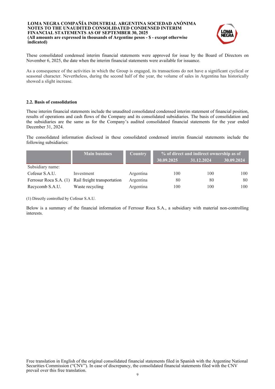 These consolidated condensed interim financial statements were approved for issue by the Board of Directors on November 6, 2025, the date when the interim financial statements were available for issuance. As a consequence of the activities in which the Group is engaged, its transactions do not have a significant cyclical or seasonal character. Nevertheless, during the second half of the year, the volume of sales in Argentina has historically showed a slight increase. 2.2. Basis of consolidation These interim financial statements include the unaudited consolidated condensed interim statement of financial position, results of operations and cash flows of the Company and its consolidated subsidiaries. The basis of consolidation and the subsidiaries are the same as for the Company’s audited consolidated financial statements for the year ended December 31, 2024. The consolidated information disclosed in these consolidated condensed interim financial statements include the following subsidiaries: Main bussines Country % of direct and indirect ownership as of 30.09.2025 31.12.2024 30.09.2024 Subsidiary name: Cofesur S.A.U. Investment Argentina 100 100 100 Ferrosur Roca S.A. (1) Rail freight transportation Argentina 80 80 80 Recycomb S.A.U. Waste recycling Argentina 100 100 100 (1) Directly controlled by Cofesur S.A.U. Below is a summary of the financial information of Ferrosur Roca S.A., a subsidiary with material non-controlling interests. LOMA NEGRA COMPAÑÍA INDUSTRIAL ARGENTINA SOCIEDAD ANÓNIMA NOTES TO THE UNAUDITED CONSOLIDATED CONDENSED INTERIM FINANCIAL STATEMENTS AS OF SEPTEMBER 30, 2025 (All amounts are expressed in thousands of Argentine pesos - $ - except otherwise indicated) Free translation in English of the original consolidated financial statements filed in Spanish with the Argentine National Securities Commission (“CNV”). In case of discrepancy, the consolidated financial statements filed with the CNV prevail over this free translation. 9