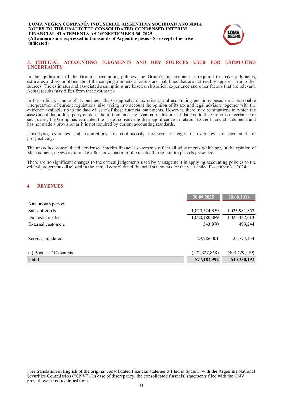 3. CRITICAL ACCOUNTING JUDGMENTS AND KEY SOURCES USED FOR ESTIMATING UNCERTAINTY In the application of the Group´s accounting policies, the Group´s management is required to make judgments, estimates and assumptions about the carrying amounts of assets and liabilities that are not readily apparent from other sources. The estimates and associated assumptions are based on historical experience and other factors that are relevant. Actual results may differ from these estimates. In the ordinary course of its business, the Group selects tax criteria and accounting positions based on a reasonable interpretation of current regulations, also taking into account the opinion of its tax and legal advisors together with the evidence available up to the date of issue of these financial statements. However, there may be situations in which the assessment that a third party could make of them and the eventual realization of damage to the Group is uncertain. For such cases, the Group has evaluated the issues considering their significance in relation to the financial statements and has not made a provision as it is not required by current accounting standards. Underlying estimates and assumptions are continuously reviewed. Changes in estimates are accounted for prospectively. The unaudited consolidated condensed interim financial statements reflect all adjustments which are, in the opinion of Management, necessary to make a fair presentation of the results for the interim periods presented. There are no significant changes to the critical judgements used by Management in applying accounting policies to the critical judgements disclosed in the annual consolidated financial statements for the year ended December 31, 2024. 4. REVENUES 30.09.2025 30.09.2024 Nine month period Sales of goods 1,020,524,859 1,023,981,857 Domestic market 1,020,180,889 1,023,482,613 External customers 343,970 499,244 Services rendered 29,286,001 25,777,454 (-) Bonuses / Discounts (472,327,868) (409,429,119) Total 577,482,992 640,330,192 LOMA NEGRA COMPAÑÍA INDUSTRIAL ARGENTINA SOCIEDAD ANÓNIMA NOTES TO THE UNAUDITED CONSOLIDATED CONDENSED INTERIM FINANCIAL STATEMENTS AS OF SEPTEMBER 30, 2025 (All amounts are expressed in thousands of Argentine pesos - $ - except otherwise indicated) Free translation in English of the original consolidated financial statements filed in Spanish with the Argentine National Securities Commission (“CNV”). In case of discrepancy, the consolidated financial statements filed with the CNV prevail over this free translation. 11