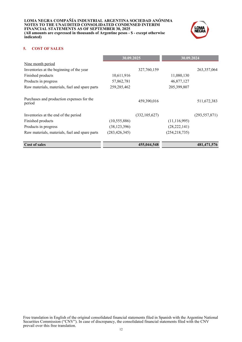 5. COST OF SALES 30.09.2025 30.09.2024 Nine month period Inventories at the beginning of the year 327,760,159 263,357,064 Finished products 10,611,916 11,080,130 Products in progress 57,862,781 46,877,127 Raw materials, materials, fuel and spare parts 259,285,462 205,399,807 Purchases and production expenses for the period 459,390,016 511,672,383 Inventories at the end of the period (332,105,627) (293,557,871) Finished products (10,555,886) (11,116,995) Products in progress (38,123,396) (28,222,141) Raw materials, materials, fuel and spare parts (283,426,345) (254,218,735) Cost of sales 455,044,548 481,471,576 LOMA NEGRA COMPAÑÍA INDUSTRIAL ARGENTINA SOCIEDAD ANÓNIMA NOTES TO THE UNAUDITED CONSOLIDATED CONDENSED INTERIM FINANCIAL STATEMENTS AS OF SEPTEMBER 30, 2025 (All amounts are expressed in thousands of Argentine pesos - $ - except otherwise indicated) Free translation in English of the original consolidated financial statements filed in Spanish with the Argentine National Securities Commission (“CNV”). In case of discrepancy, the consolidated financial statements filed with the CNV prevail over this free translation. 12