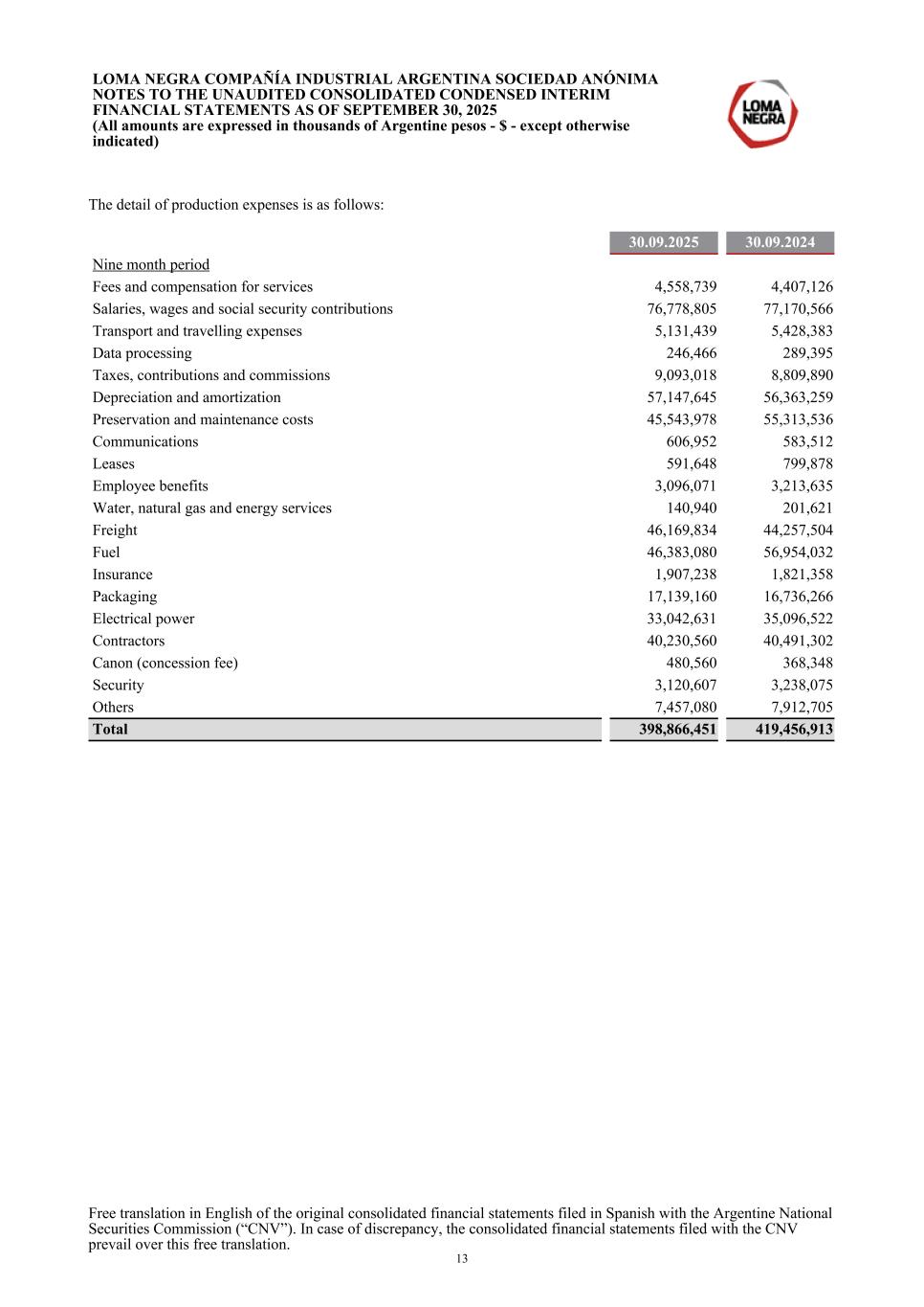 The detail of production expenses is as follows: 30.09.2025 30.09.2024 Nine month period Fees and compensation for services 4,558,739 4,407,126 Salaries, wages and social security contributions 76,778,805 77,170,566 Transport and travelling expenses 5,131,439 5,428,383 Data processing 246,466 289,395 Taxes, contributions and commissions 9,093,018 8,809,890 Depreciation and amortization 57,147,645 56,363,259 Preservation and maintenance costs 45,543,978 55,313,536 Communications 606,952 583,512 Leases 591,648 799,878 Employee benefits 3,096,071 3,213,635 Water, natural gas and energy services 140,940 201,621 Freight 46,169,834 44,257,504 Fuel 46,383,080 56,954,032 Insurance 1,907,238 1,821,358 Packaging 17,139,160 16,736,266 Electrical power 33,042,631 35,096,522 Contractors 40,230,560 40,491,302 Canon (concession fee) 480,560 368,348 Security 3,120,607 3,238,075 Others 7,457,080 7,912,705 Total 398,866,451 419,456,913 LOMA NEGRA COMPAÑÍA INDUSTRIAL ARGENTINA SOCIEDAD ANÓNIMA NOTES TO THE UNAUDITED CONSOLIDATED CONDENSED INTERIM FINANCIAL STATEMENTS AS OF SEPTEMBER 30, 2025 (All amounts are expressed in thousands of Argentine pesos - $ - except otherwise indicated) Free translation in English of the original consolidated financial statements filed in Spanish with the Argentine National Securities Commission (“CNV”). In case of discrepancy, the consolidated financial statements filed with the CNV prevail over this free translation. 13