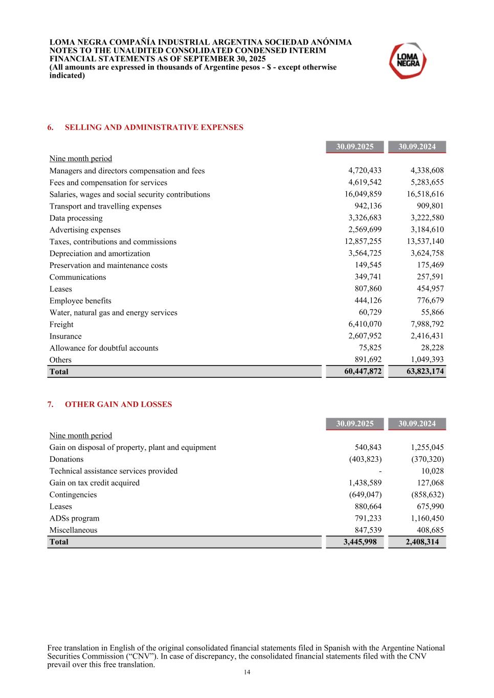6. SELLING AND ADMINISTRATIVE EXPENSES 30.09.2025 30.09.2024 Nine month period Managers and directors compensation and fees 4,720,433 4,338,608 Fees and compensation for services 4,619,542 5,283,655 Salaries, wages and social security contributions 16,049,859 16,518,616 Transport and travelling expenses 942,136 909,801 Data processing 3,326,683 3,222,580 Advertising expenses 2,569,699 3,184,610 Taxes, contributions and commissions 12,857,255 13,537,140 Depreciation and amortization 3,564,725 3,624,758 Preservation and maintenance costs 149,545 175,469 Communications 349,741 257,591 Leases 807,860 454,957 Employee benefits 444,126 776,679 Water, natural gas and energy services 60,729 55,866 Freight 6,410,070 7,988,792 Insurance 2,607,952 2,416,431 Allowance for doubtful accounts 75,825 28,228 Others 891,692 1,049,393 Total 60,447,872 63,823,174 7. OTHER GAIN AND LOSSES 30.09.2025 30.09.2024 Nine month period Gain on disposal of property, plant and equipment 540,843 1,255,045 Donations (403,823) (370,320) Technical assistance services provided - 10,028 Gain on tax credit acquired 1,438,589 127,068 Contingencies (649,047) (858,632) Leases 880,664 675,990 ADSs program 791,233 1,160,450 Miscellaneous 847,539 408,685 Total 3,445,998 2,408,314 LOMA NEGRA COMPAÑÍA INDUSTRIAL ARGENTINA SOCIEDAD ANÓNIMA NOTES TO THE UNAUDITED CONSOLIDATED CONDENSED INTERIM FINANCIAL STATEMENTS AS OF SEPTEMBER 30, 2025 (All amounts are expressed in thousands of Argentine pesos - $ - except otherwise indicated) Free translation in English of the original consolidated financial statements filed in Spanish with the Argentine National Securities Commission (“CNV”). In case of discrepancy, the consolidated financial statements filed with the CNV prevail over this free translation. 14