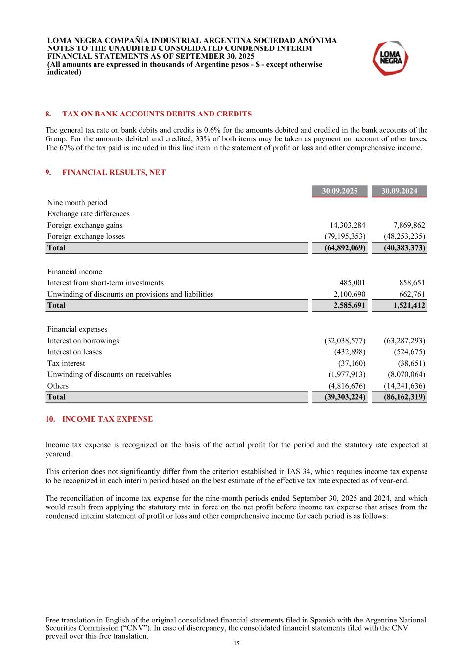 8. TAX ON BANK ACCOUNTS DEBITS AND CREDITS The general tax rate on bank debits and credits is 0.6% for the amounts debited and credited in the bank accounts of the Group. For the amounts debited and credited, 33% of both items may be taken as payment on account of other taxes. The 67% of the tax paid is included in this line item in the statement of profit or loss and other comprehensive income. 9. FINANCIAL RESULTS, NET 30.09.2025 30.09.2024 Nine month period Exchange rate differences Foreign exchange gains 14,303,284 7,869,862 Foreign exchange losses (79,195,353) (48,253,235) Total (64,892,069) (40,383,373) Financial income Interest from short-term investments 485,001 858,651 Unwinding of discounts on provisions and liabilities 2,100,690 662,761 Total 2,585,691 1,521,412 Financial expenses Interest on borrowings (32,038,577) (63,287,293) Interest on leases (432,898) (524,675) Tax interest (37,160) (38,651) Unwinding of discounts on receivables (1,977,913) (8,070,064) Others (4,816,676) (14,241,636) Total (39,303,224) (86,162,319) 10. INCOME TAX EXPENSE Income tax expense is recognized on the basis of the actual profit for the period and the statutory rate expected at yearend. This criterion does not significantly differ from the criterion established in IAS 34, which requires income tax expense to be recognized in each interim period based on the best estimate of the effective tax rate expected as of year-end. The reconciliation of income tax expense for the nine-month periods ended September 30, 2025 and 2024, and which would result from applying the statutory rate in force on the net profit before income tax expense that arises from the condensed interim statement of profit or loss and other comprehensive income for each period is as follows: LOMA NEGRA COMPAÑÍA INDUSTRIAL ARGENTINA SOCIEDAD ANÓNIMA NOTES TO THE UNAUDITED CONSOLIDATED CONDENSED INTERIM FINANCIAL STATEMENTS AS OF SEPTEMBER 30, 2025 (All amounts are expressed in thousands of Argentine pesos - $ - except otherwise indicated) Free translation in English of the original consolidated financial statements filed in Spanish with the Argentine National Securities Commission (“CNV”). In case of discrepancy, the consolidated financial statements filed with the CNV prevail over this free translation. 15