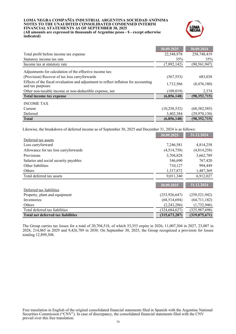 30.09.2025 30.09.2024 Total profit before income tax expense 22,548,978 258,748,419 Statutory income tax rate 35 % 35 % Income tax at statutory rate (7,892,142) (90,561,947) Adjustments for calculation of the effective income tax: (Provision) Recover of tax loss carryforwards (567,553) 683,038 Effects of the fiscal revaluation and adjustment to reflect inflation for accounting and tax purposes 1,712,566 (8,476,180) Other non-taxable income or non-deductible expense, net (109,019) 2,374 Total income tax expense (6,856,148) (98,352,715) INCOME TAX Current (10,258,532) (68,382,585) Deferred 3,402,384 (29,970,130) Total (6,856,148) (98,352,715) Likewise, the breakdown of deferred income as of September 30, 2025 and December 31, 2024 is as follows: 30.09.2025 31.12.2024 Deferred tax assets Loss carryforward 7,246,581 4,814,258 Allowance for tax loss carryforwards (4,514,758) (4,814,258) Provisions 3,704,828 3,662,789 Salaries and social security payables 546,690 767,420 Other liabilities 710,127 994,449 Others 1,317,872 1,487,369 Total deferred tax assets 9,011,340 6,912,027 30.09.2025 31.12.2024 Deferred tax liabilities Property, plant and equipment (253,926,647) (259,521,942) Inventories (68,514,694) (64,711,182) Others (2,243,286) (1,732,946) Total deferred tax liabilities (324,684,627) (325,987,698) Total net deferred tax liabilities (315,673,287) (319,075,671) The Group carries tax losses for a total of 20,704,518, of which 33,353 expire in 2026, 11,007,304 in 2027, 23,007 in 2028, 214,065 in 2029 and 9,426,789 in 2030. On September 30, 2025, the Group recognized a provision for losses totaling 12,899,308. LOMA NEGRA COMPAÑÍA INDUSTRIAL ARGENTINA SOCIEDAD ANÓNIMA NOTES TO THE UNAUDITED CONSOLIDATED CONDENSED INTERIM FINANCIAL STATEMENTS AS OF SEPTEMBER 30, 2025 (All amounts are expressed in thousands of Argentine pesos - $ - except otherwise indicated) Free translation in English of the original consolidated financial statements filed in Spanish with the Argentine National Securities Commission (“CNV”). In case of discrepancy, the consolidated financial statements filed with the CNV prevail over this free translation. 16