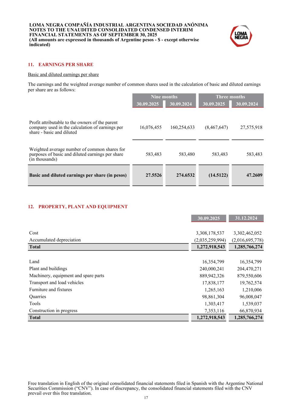 11. EARNINGS PER SHARE Basic and diluted earnings per share The earnings and the weighted average number of common shares used in the calculation of basic and diluted earnings per share are as follows: Nine months Three months 30.09.2025 30.09.2024 30.09.2025 30.09.2024 Profit attributable to the owners of the parent company used in the calculation of earnings per share - basic and diluted 16,076,455 160,254,633 (8,467,647) 27,575,918 Weighted average number of common shares for purposes of basic and diluted earnings per share (in thousands) 583,483 583,480 583,483 583,483 Basic and diluted earnings per share (in pesos) 27.5526 274.6532 (14.5122) 47.2609 12. PROPERTY, PLANT AND EQUIPMENT 30.09.2025 31.12.2024 Cost 3,308,178,537 3,302,462,052 Accumulated depreciation (2,035,259,994) (2,016,695,778) Total 1,272,918,543 1,285,766,274 Land 16,354,799 16,354,799 Plant and buildings 240,000,241 204,470,271 Machinery, equipment and spare parts 889,942,326 879,550,606 Transport and load vehicles 17,838,177 19,762,574 Furniture and fixtures 1,265,163 1,210,006 Quarries 98,861,304 96,008,047 Tools 1,303,417 1,539,037 Construction in progress 7,353,116 66,870,934 Total 1,272,918,543 1,285,766,274 LOMA NEGRA COMPAÑÍA INDUSTRIAL ARGENTINA SOCIEDAD ANÓNIMA NOTES TO THE UNAUDITED CONSOLIDATED CONDENSED INTERIM FINANCIAL STATEMENTS AS OF SEPTEMBER 30, 2025 (All amounts are expressed in thousands of Argentine pesos - $ - except otherwise indicated) Free translation in English of the original consolidated financial statements filed in Spanish with the Argentine National Securities Commission (“CNV”). In case of discrepancy, the consolidated financial statements filed with the CNV prevail over this free translation. 17