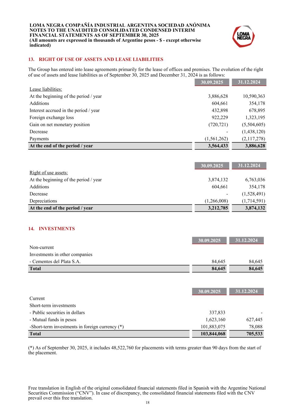 13. RIGHT OF USE OF ASSETS AND LEASE LIABILITIES The Group has entered into lease agreements primarily for the lease of offices and premises. The evolution of the right of use of assets and lease liabilities as of September 30, 2025 and December 31, 2024 is as follows: 30.09.2025 31.12.2024 Lease liabilities: At the beginning of the period / year 3,886,628 10,590,363 Additions 604,661 354,178 Interest accrued in the period / year 432,898 678,895 Foreign exchange loss 922,229 1,323,195 Gain on net monetary position (720,721) (5,504,605) Decrease - (1,438,120) Payments (1,561,262) (2,117,278) At the end of the period / year 3,564,433 3,886,628 30.09.2025 31.12.2024 Right of use assets: At the beginning of the period / year 3,874,132 6,763,036 Additions 604,661 354,178 Decrease - (1,528,491) Depreciations (1,266,008) (1,714,591) At the end of the period / year 3,212,785 3,874,132 14. INVESTMENTS 30.09.2025 31.12.2024 Non-current Investments in other companies - Cementos del Plata S.A. 84,645 84,645 Total 84,645 84,645 30.09.2025 31.12.2024 Current Short-term investments - Public securities in dollars 337,833 - - Mutual funds in pesos 1,623,160 627,445 -Short-term investments in foreign currency (*) 101,883,075 78,088 Total 103,844,068 705,533 (*) As of September 30, 2025, it includes 48,522,760 for placements with terms greater than 90 days from the start of the placement. LOMA NEGRA COMPAÑÍA INDUSTRIAL ARGENTINA SOCIEDAD ANÓNIMA NOTES TO THE UNAUDITED CONSOLIDATED CONDENSED INTERIM FINANCIAL STATEMENTS AS OF SEPTEMBER 30, 2025 (All amounts are expressed in thousands of Argentine pesos - $ - except otherwise indicated) Free translation in English of the original consolidated financial statements filed in Spanish with the Argentine National Securities Commission (“CNV”). In case of discrepancy, the consolidated financial statements filed with the CNV prevail over this free translation. 18